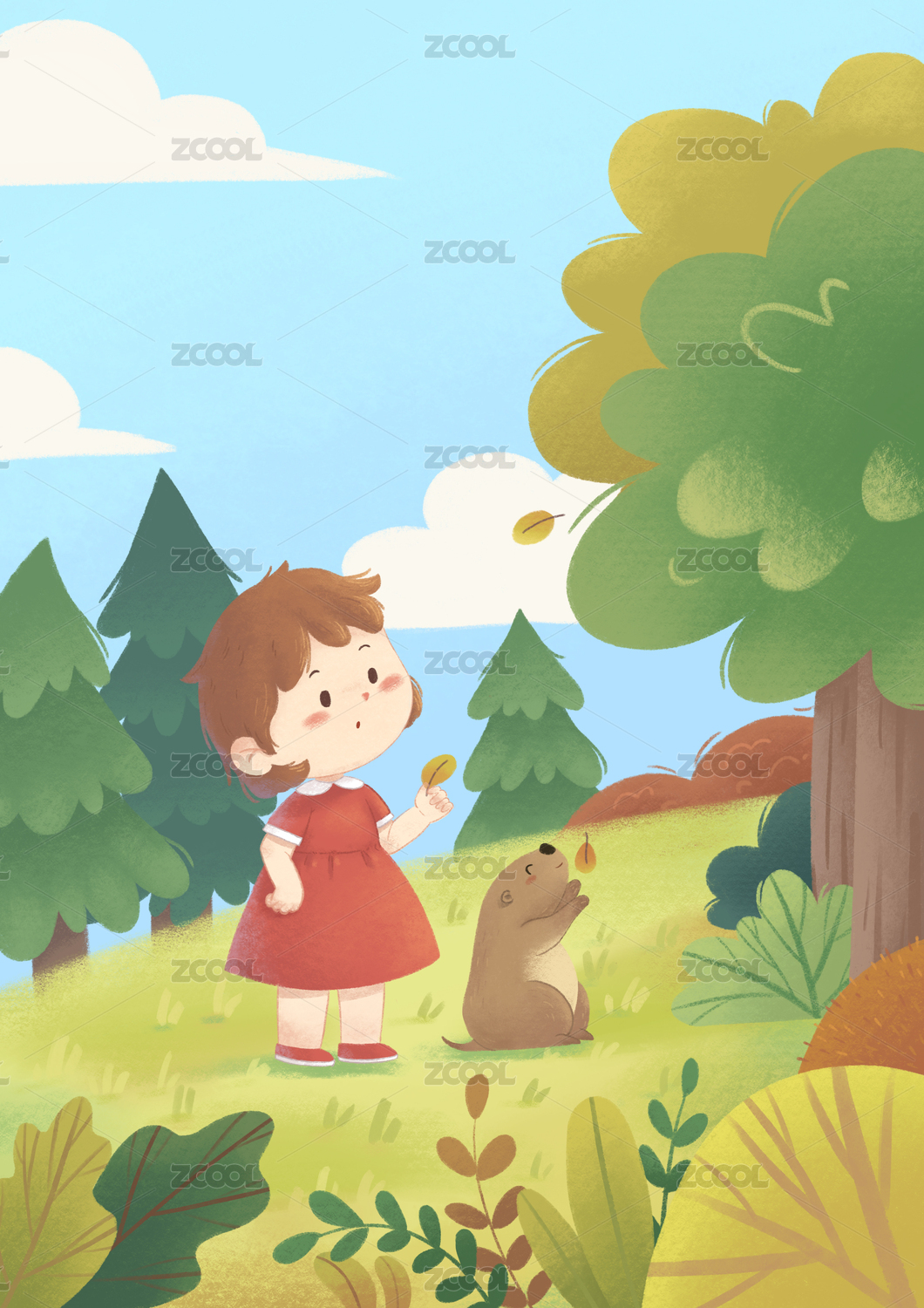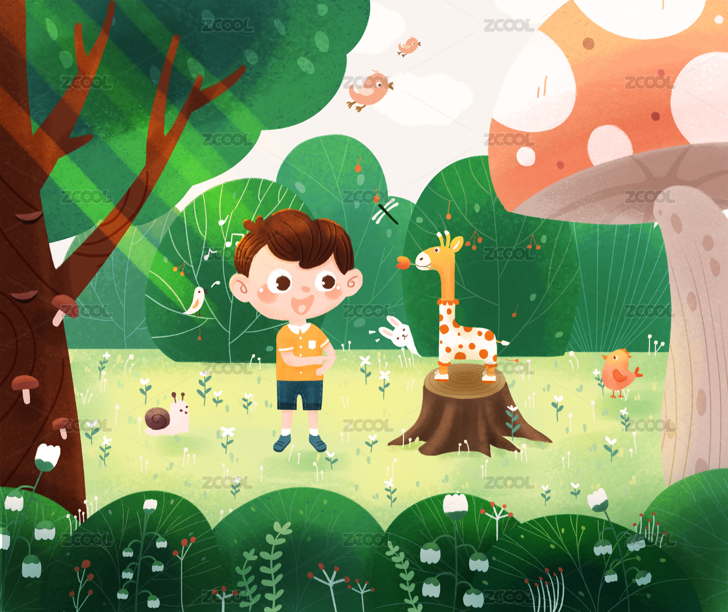 男孩在森林里指着树桩上的长颈鹿笑儿童绘本