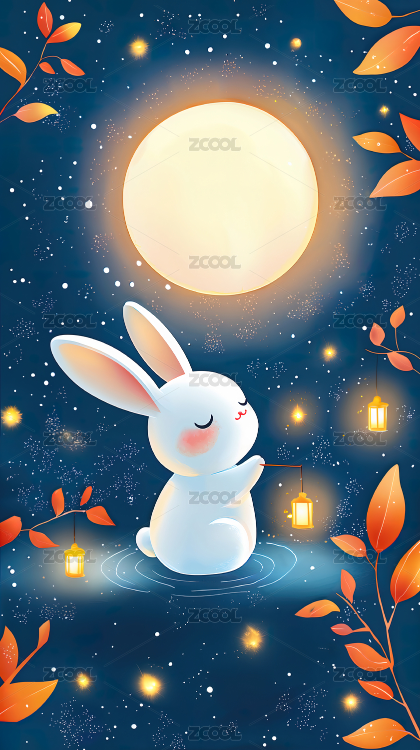 月满中秋节日玉兔愉快地赏月氛围感美景