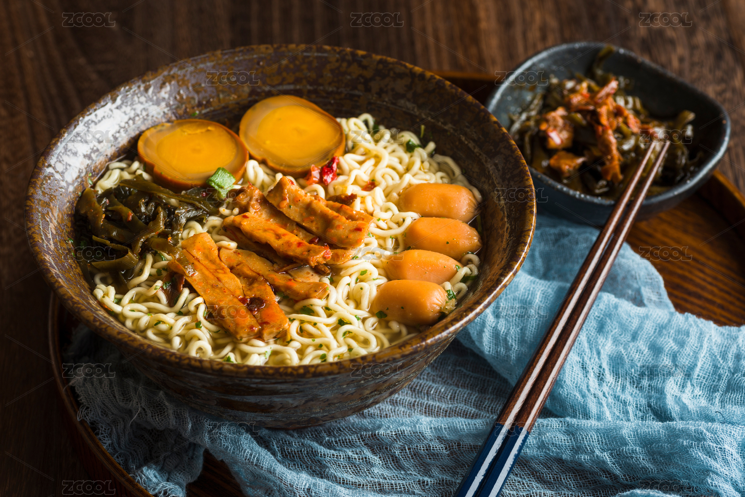 搭配有卤鸡蛋和脆皮肠以及卤香干的泡面