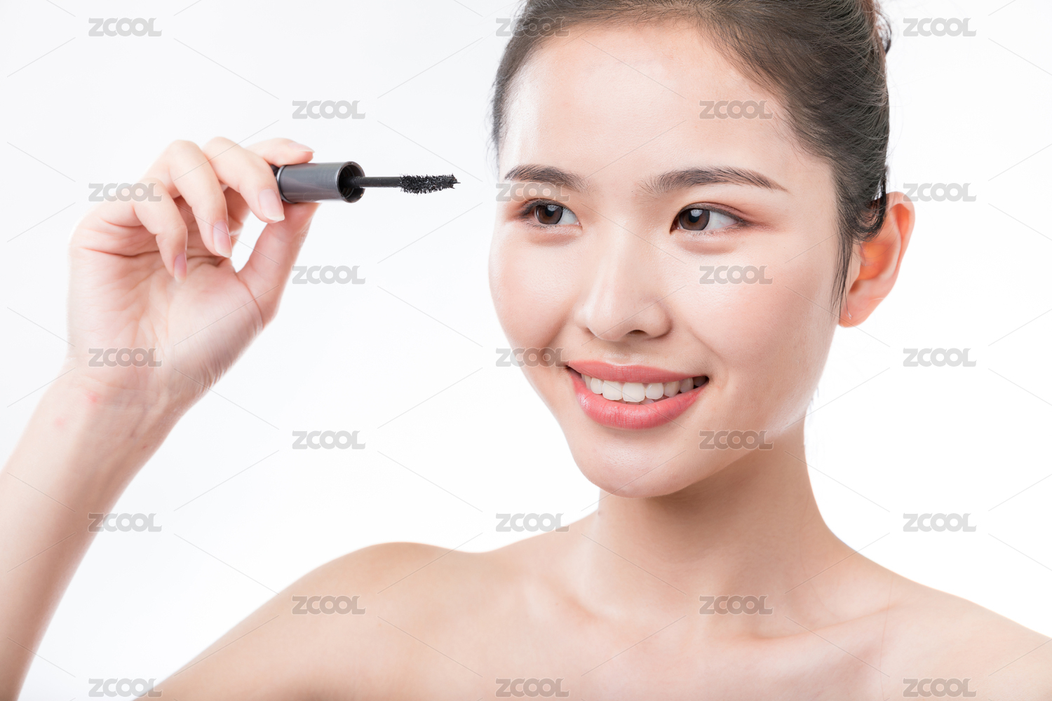年轻女性使用睫毛膏化妆