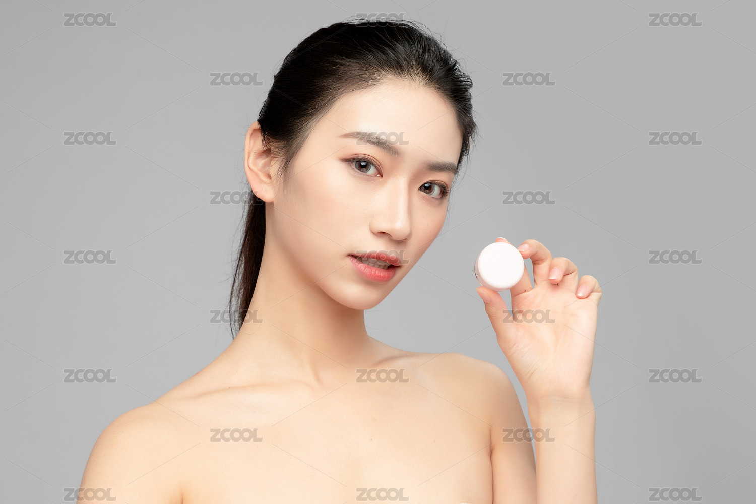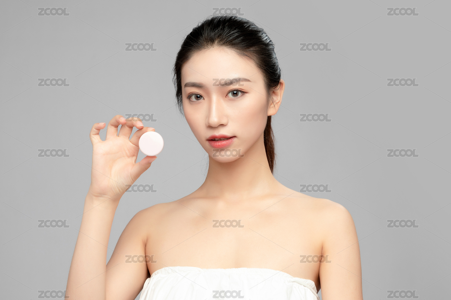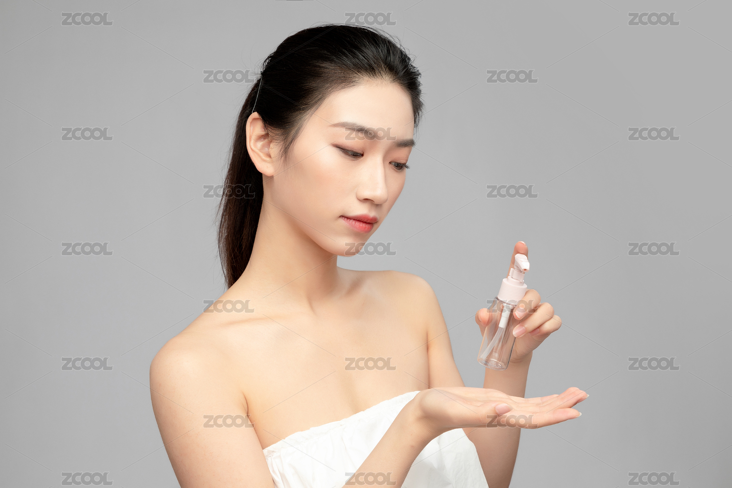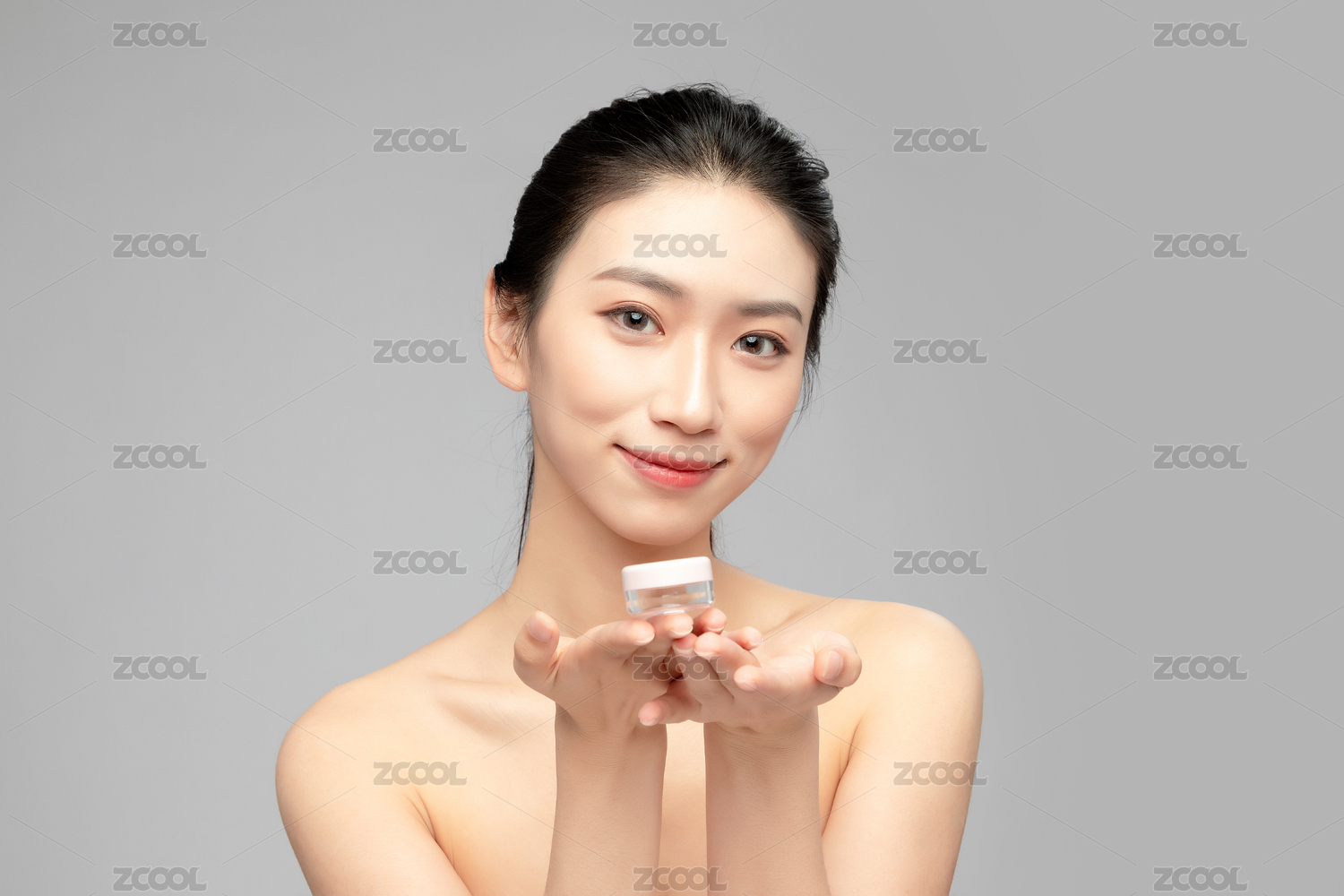 灰色背景里手中拿着塑料小瓶作为展示的亚洲美女面部特写,化妆护肤整容