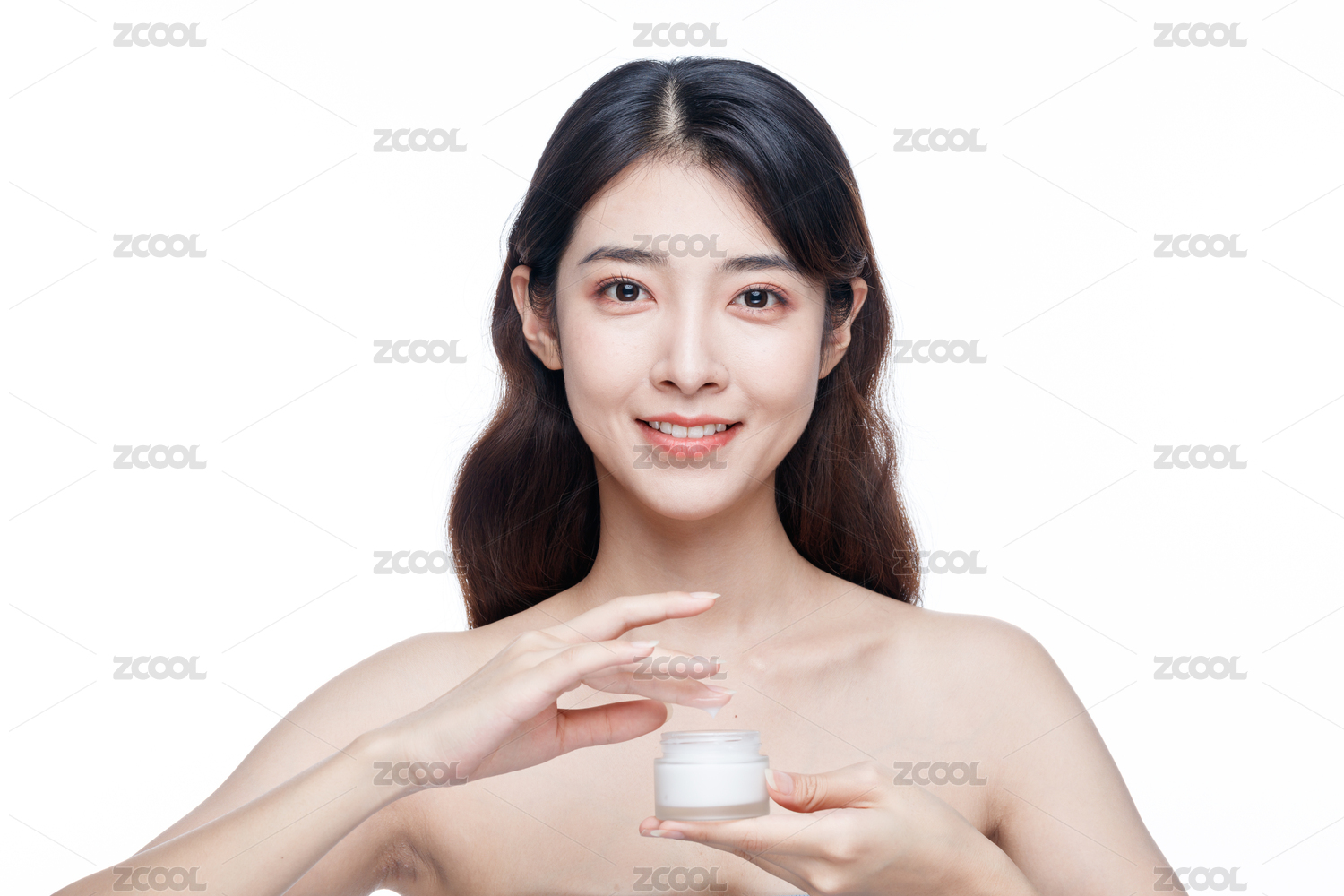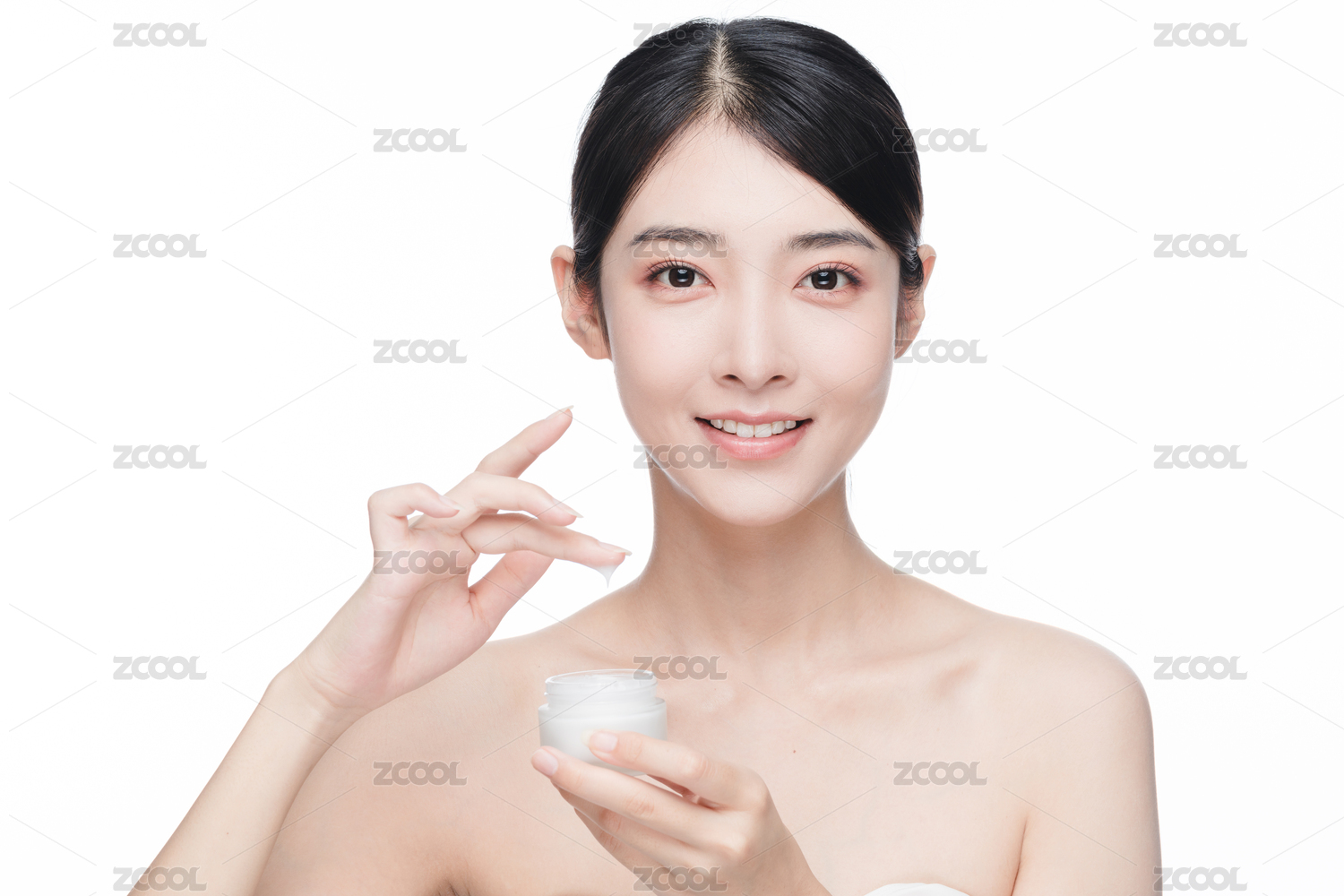 漂亮的亚洲美女抹面霜白色背景半身肖像