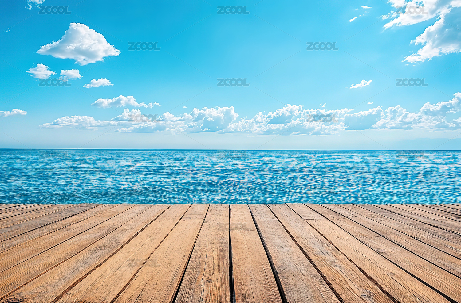 空旷的木地板路面和蓝天白云下美丽的大海