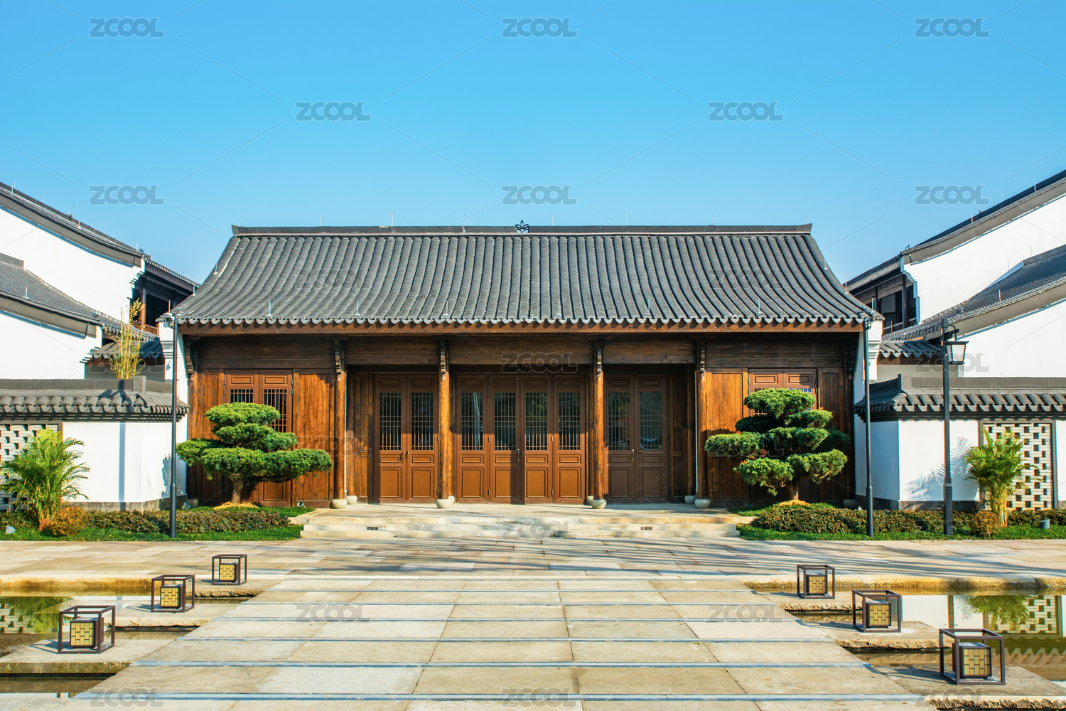 晴朗蓝天下独栋古典徽派建筑的正面视图
