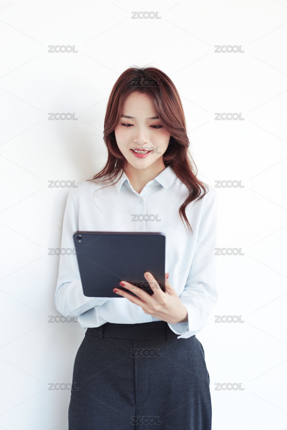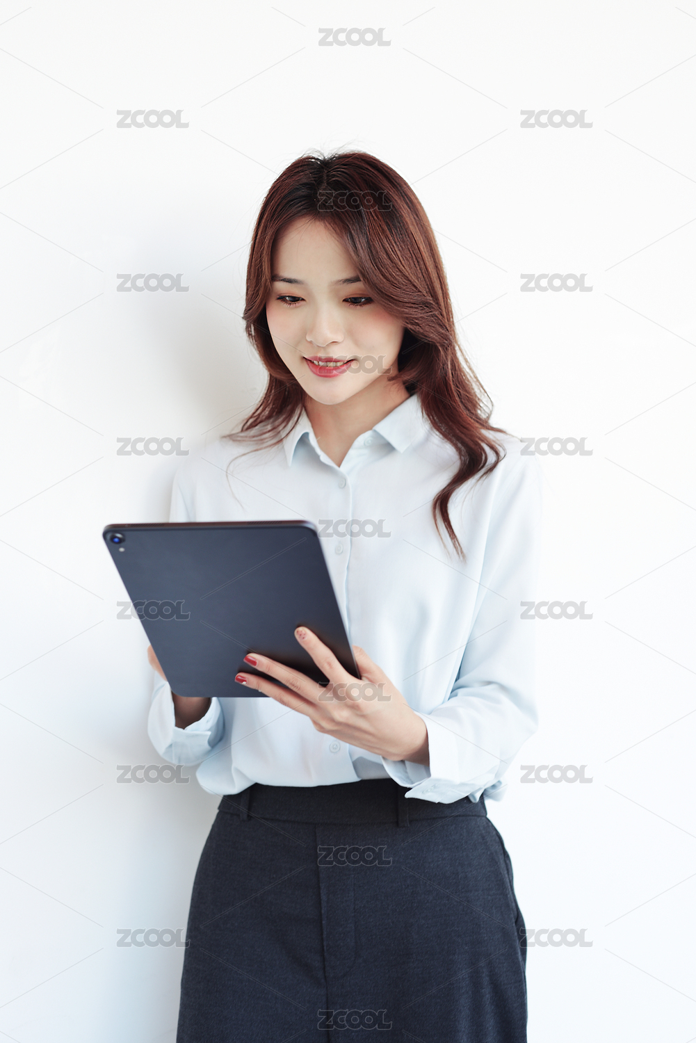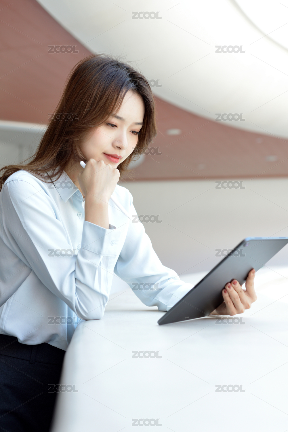 一个亚裔职业年轻女性正专注地看着平板电脑