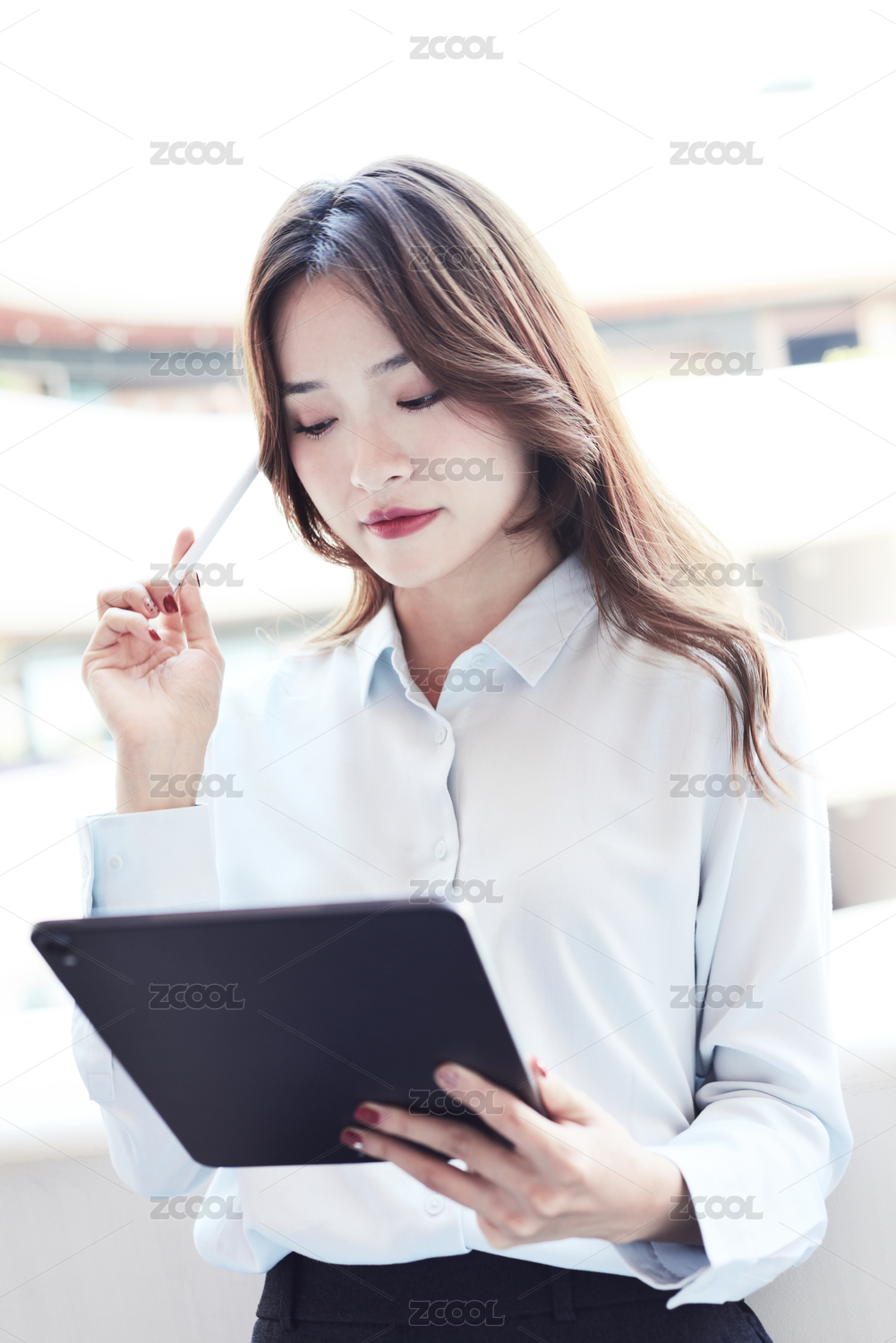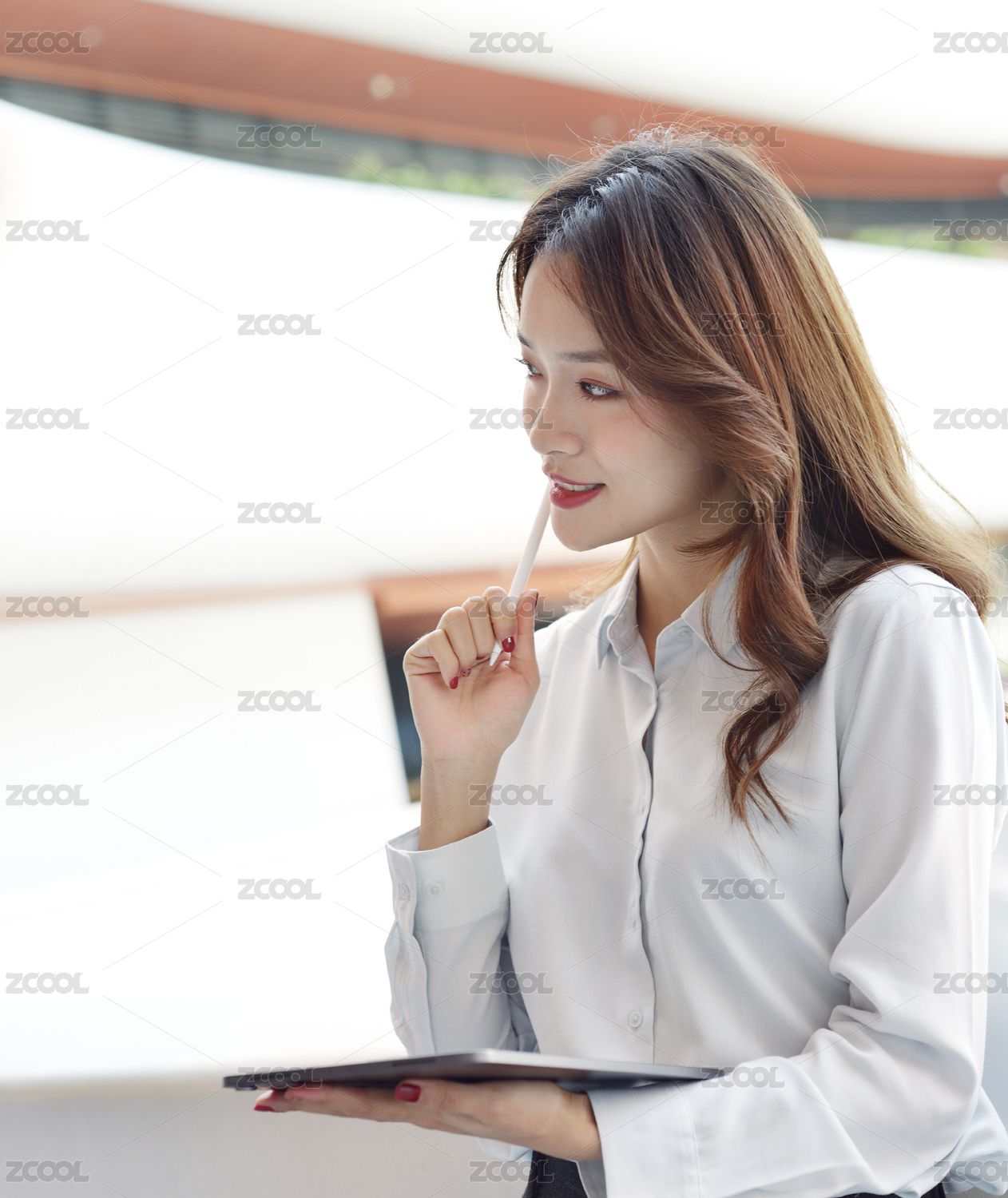 一个亚裔职业年轻女性手拿着笔和平板电脑在思考