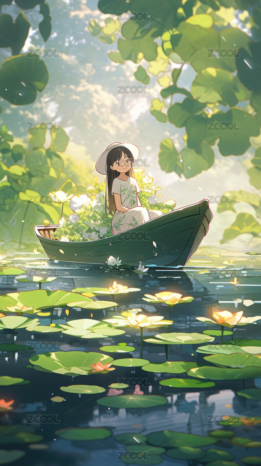 夏天立夏一个小孩在荷花池中划船唯美插画