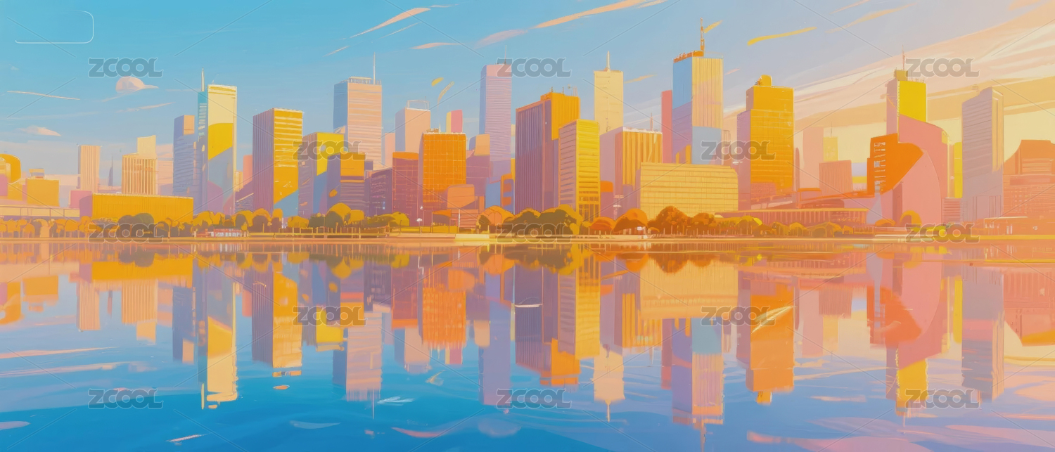 夕阳下城市剪影与水面倒影