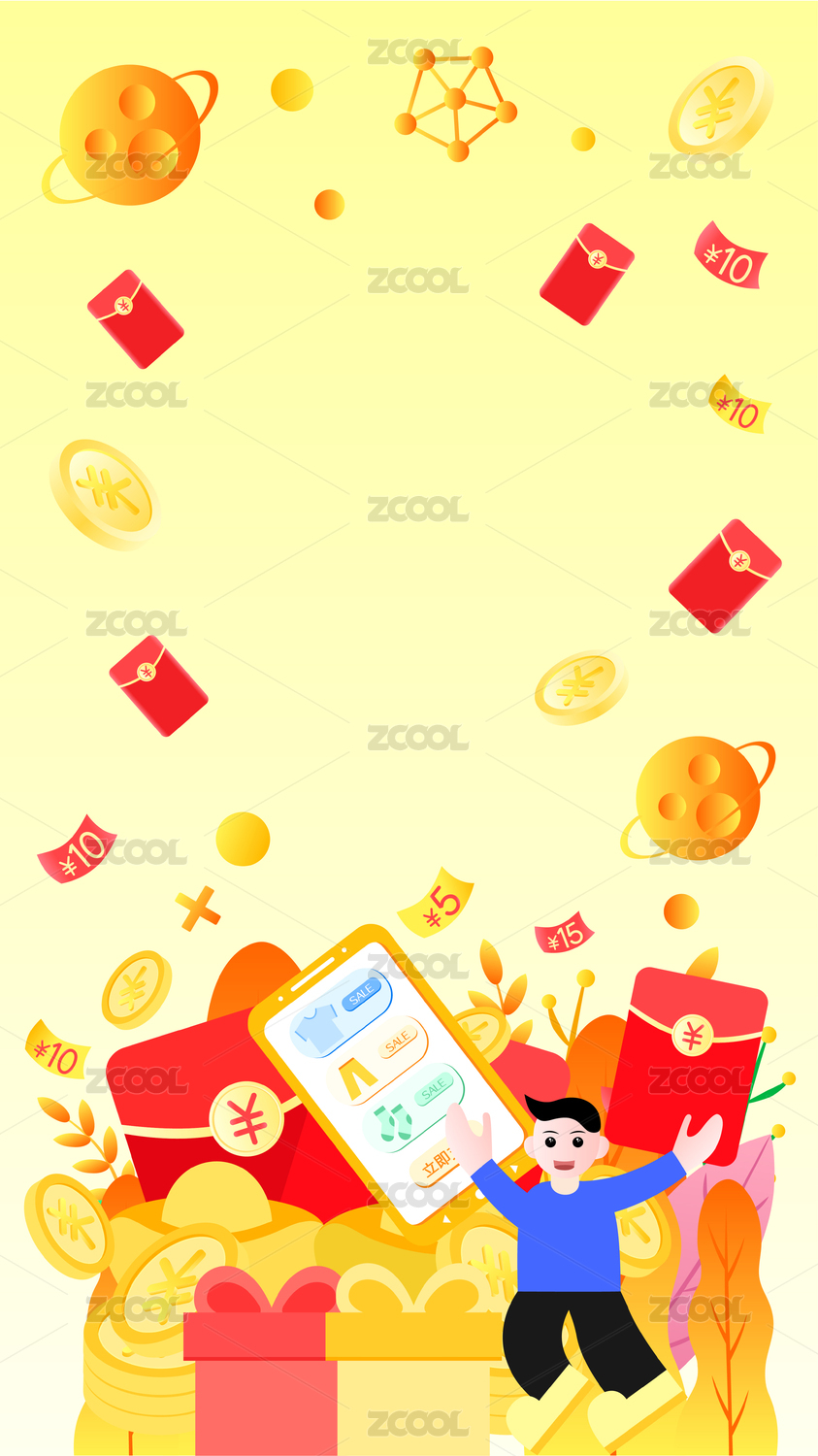 炫彩红包雨来袭优惠券金币飘飞矢量插画