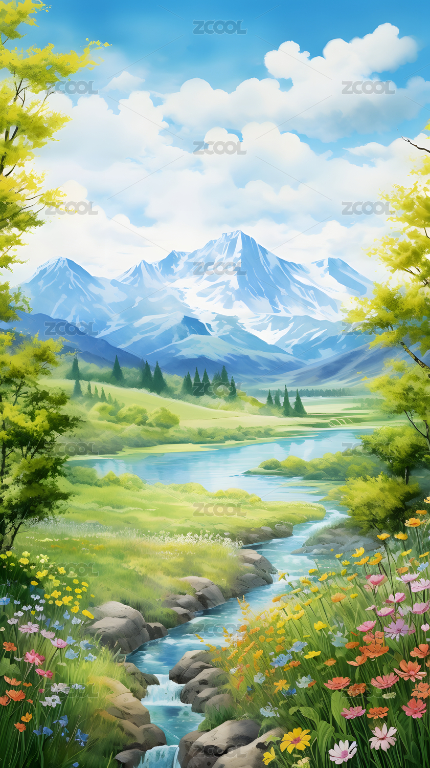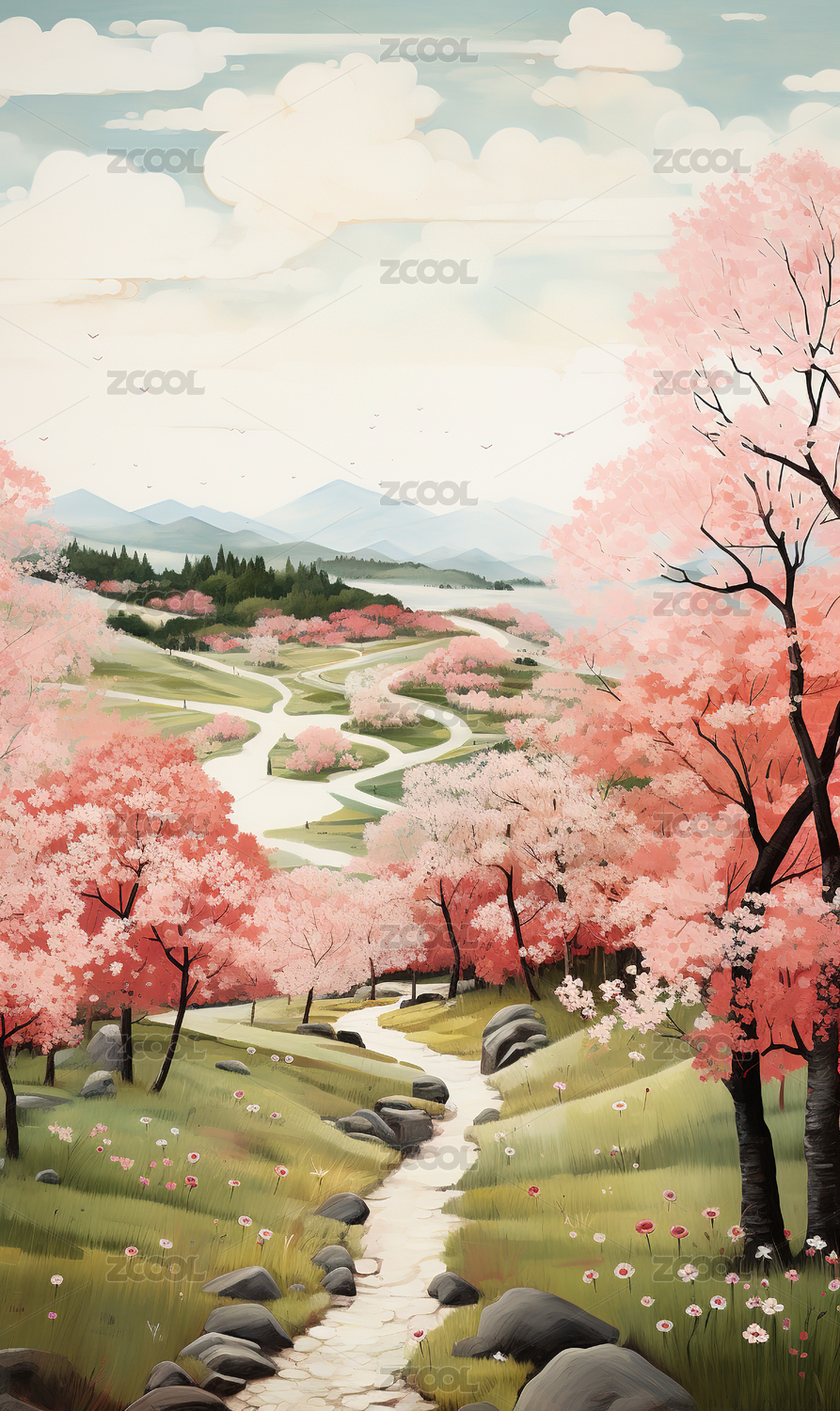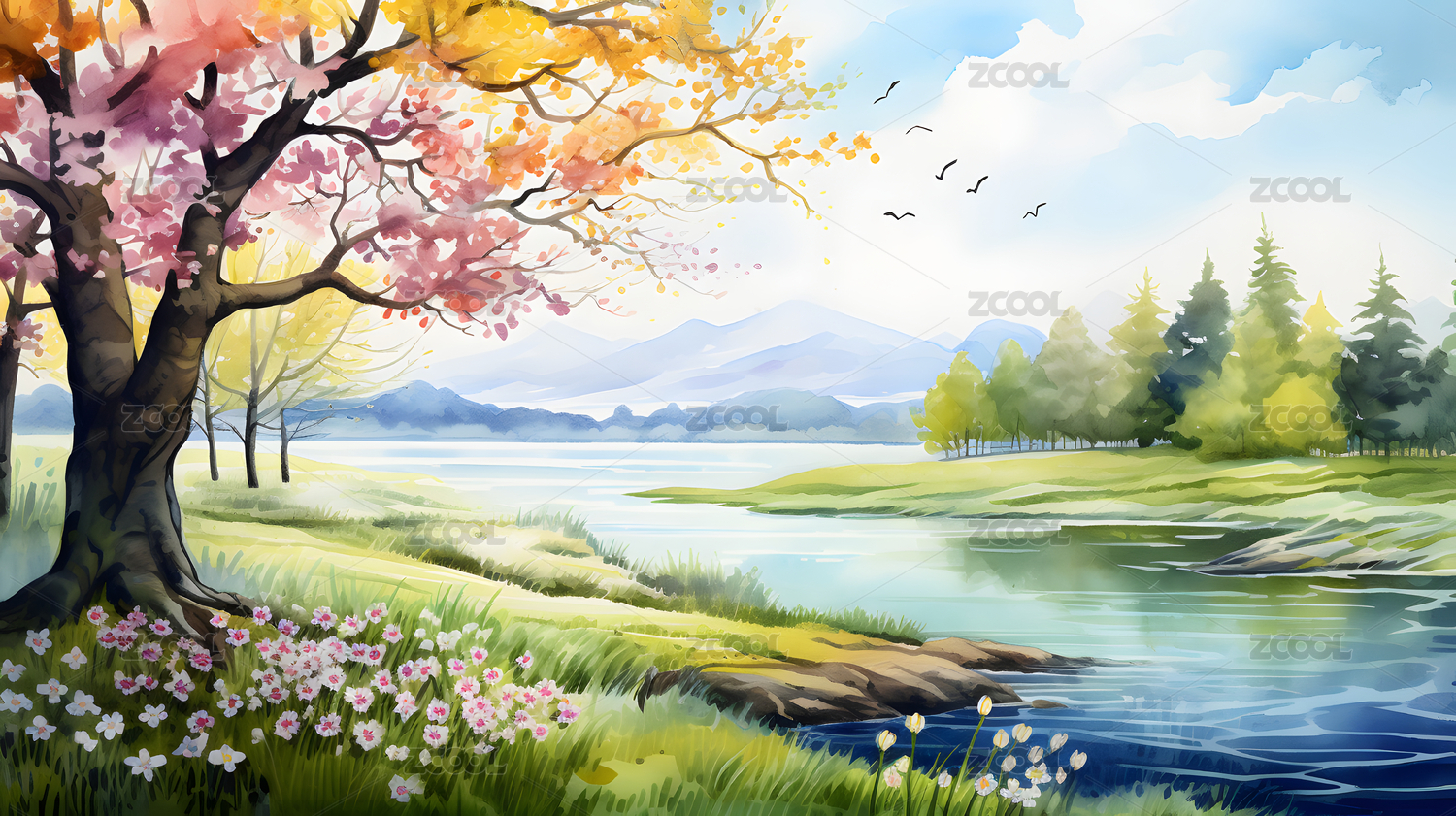 数码水彩湖泊花朵树木风景抽象图形海报背景