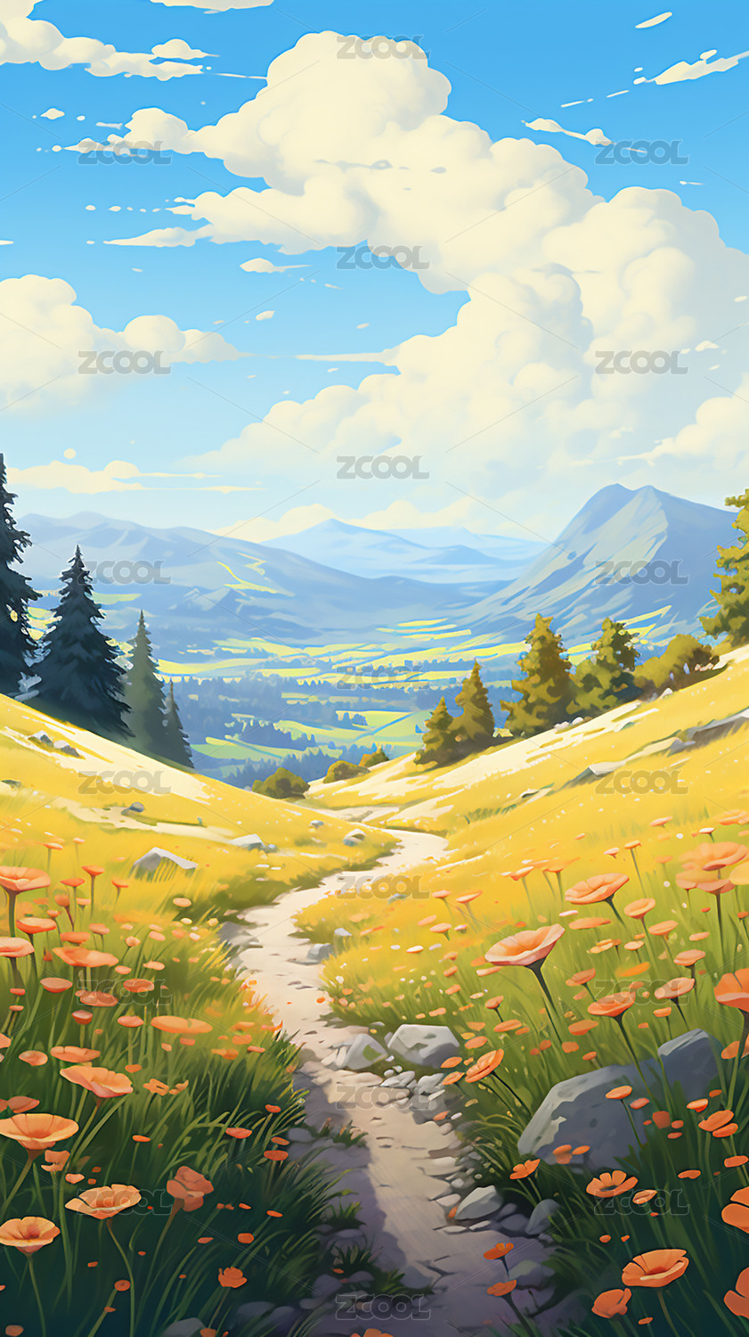 夏季晴朗蓝天白云辽阔无边的的沙漠绘画插画