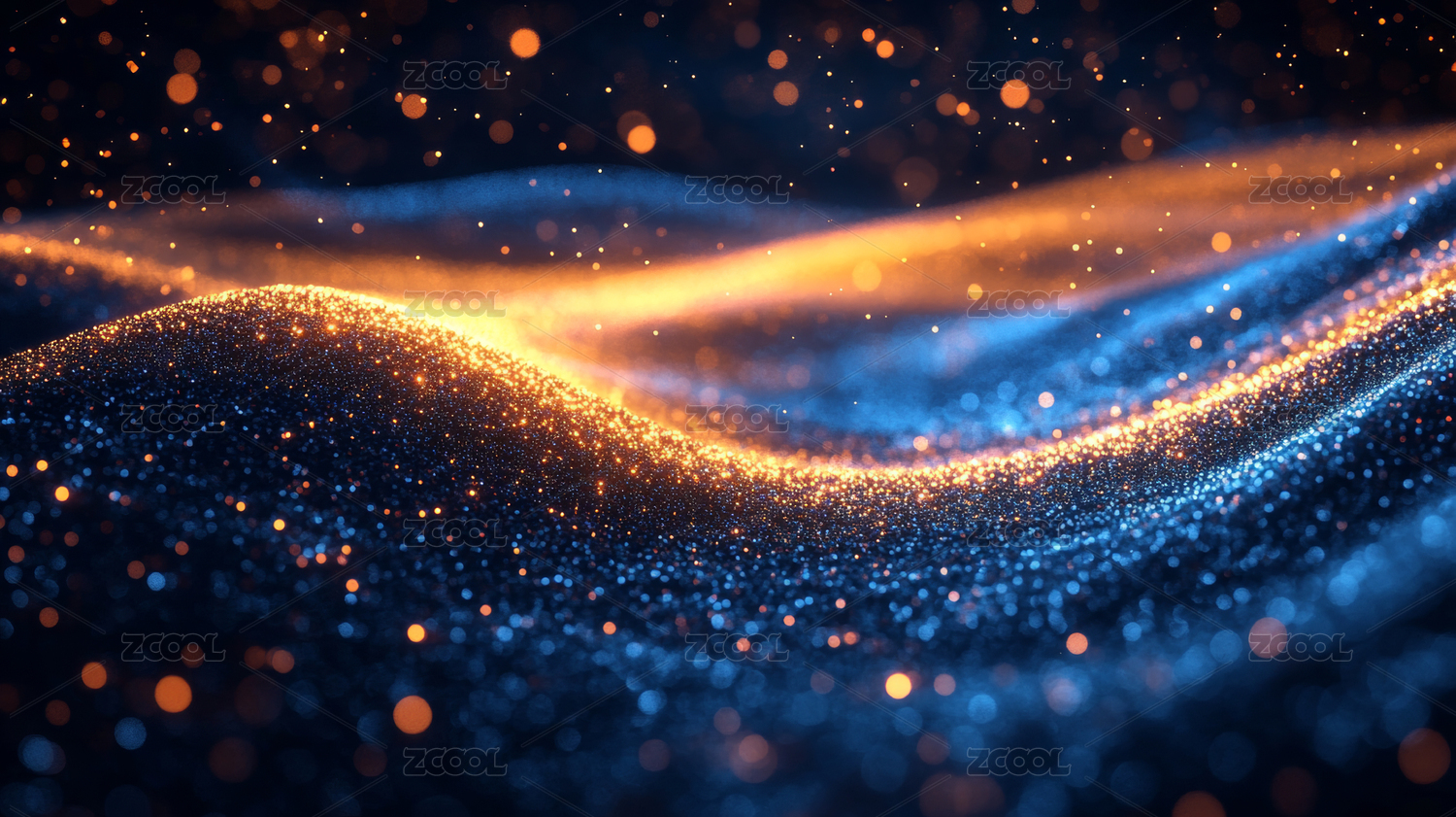 动态发光粒子与深蓝色波浪背景