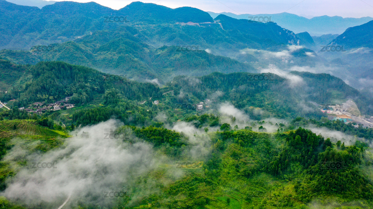 中国湖北宜昌柏家坪村雨后清晨航拍