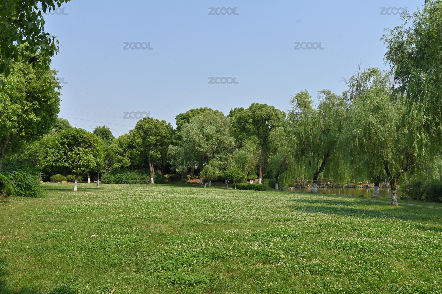 公园春天自然景观茂盛的树林和盛放的锦秀杜