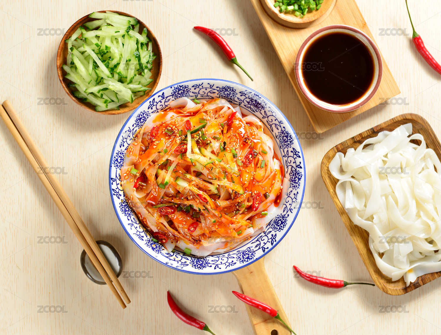 复古背景上的西安美食秘制呱呱凉皮擀面皮