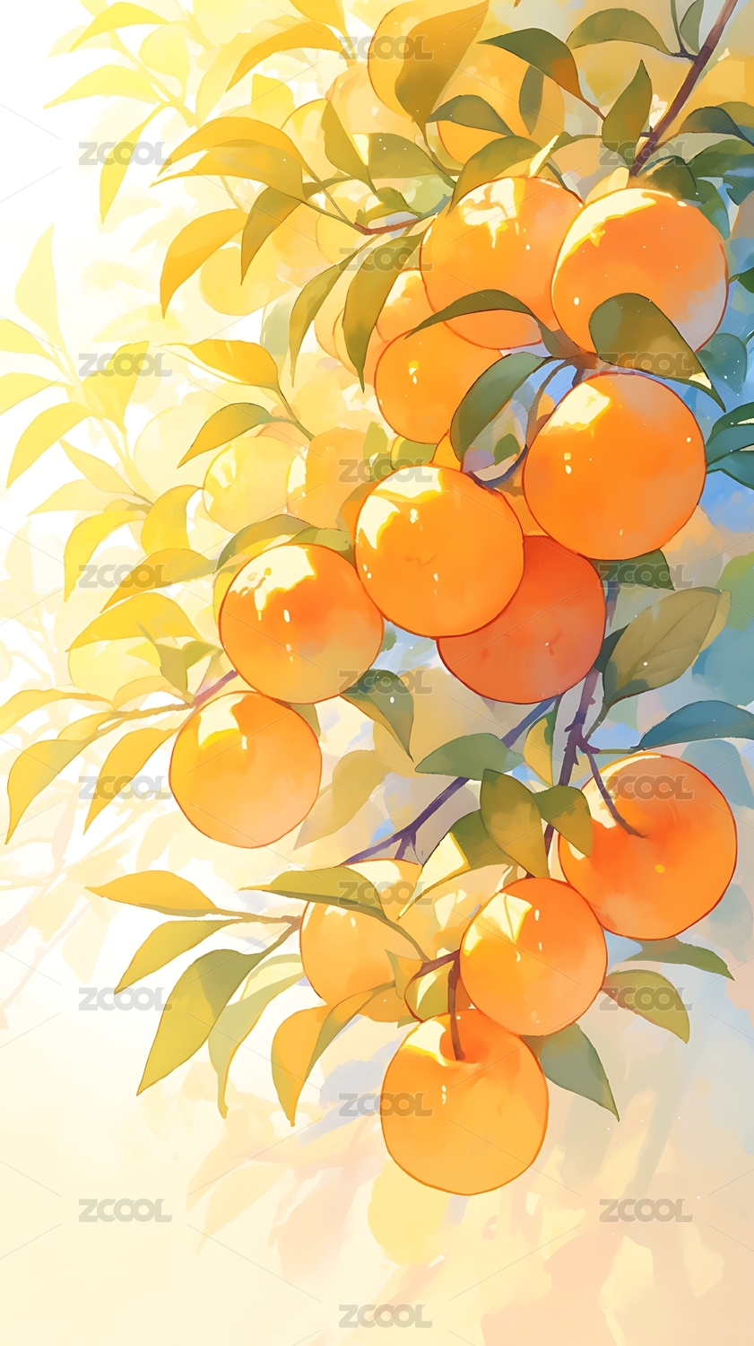 阳光下树枝上挂满黄色梨子,背景金黄色调