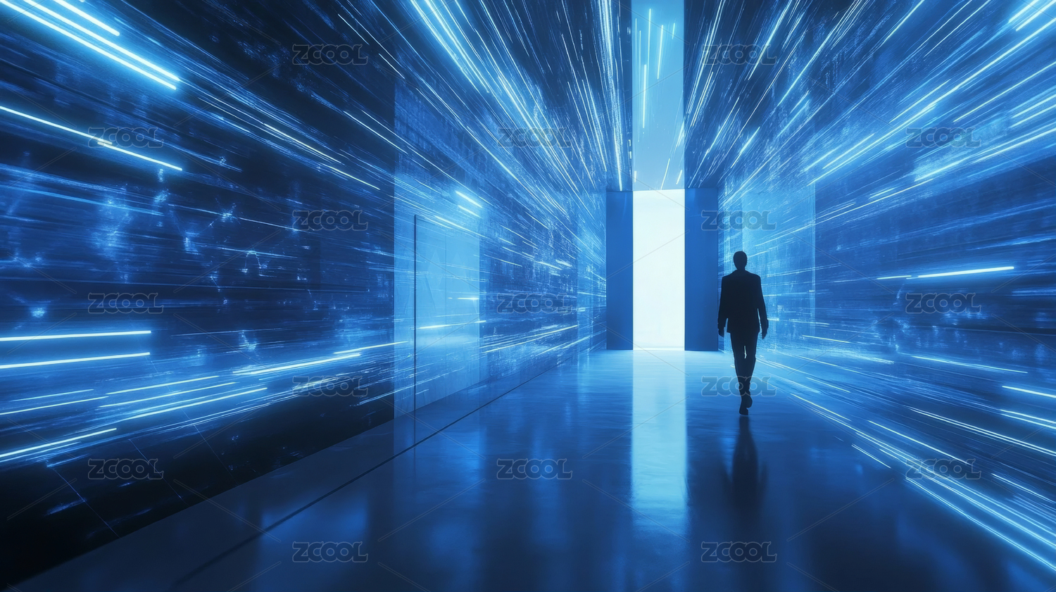 走向光明的男人背影与数据流通道