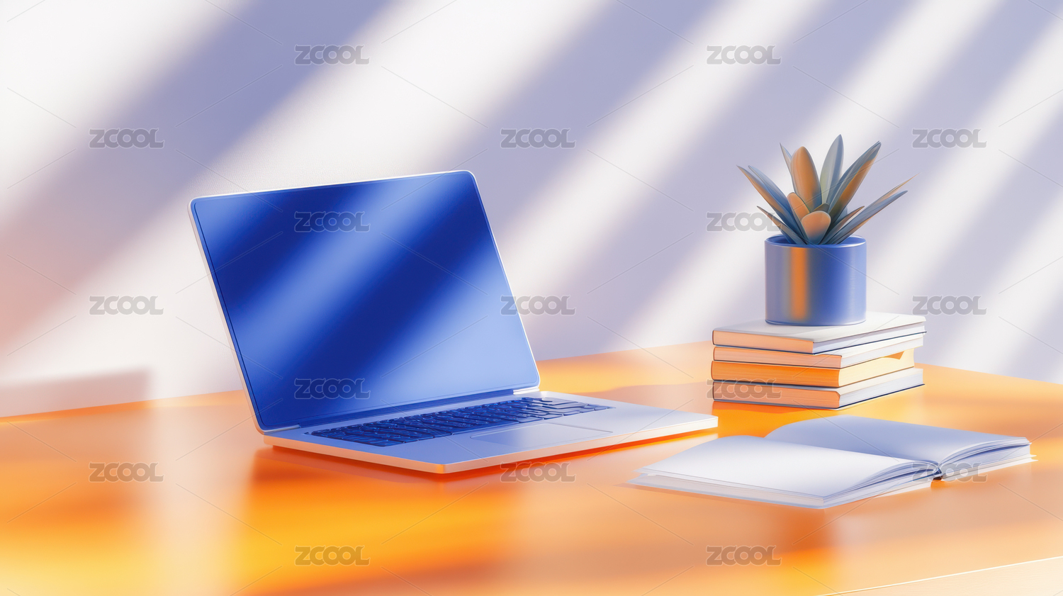 办公室办公桌上的笔记本电脑和盆栽植物特写