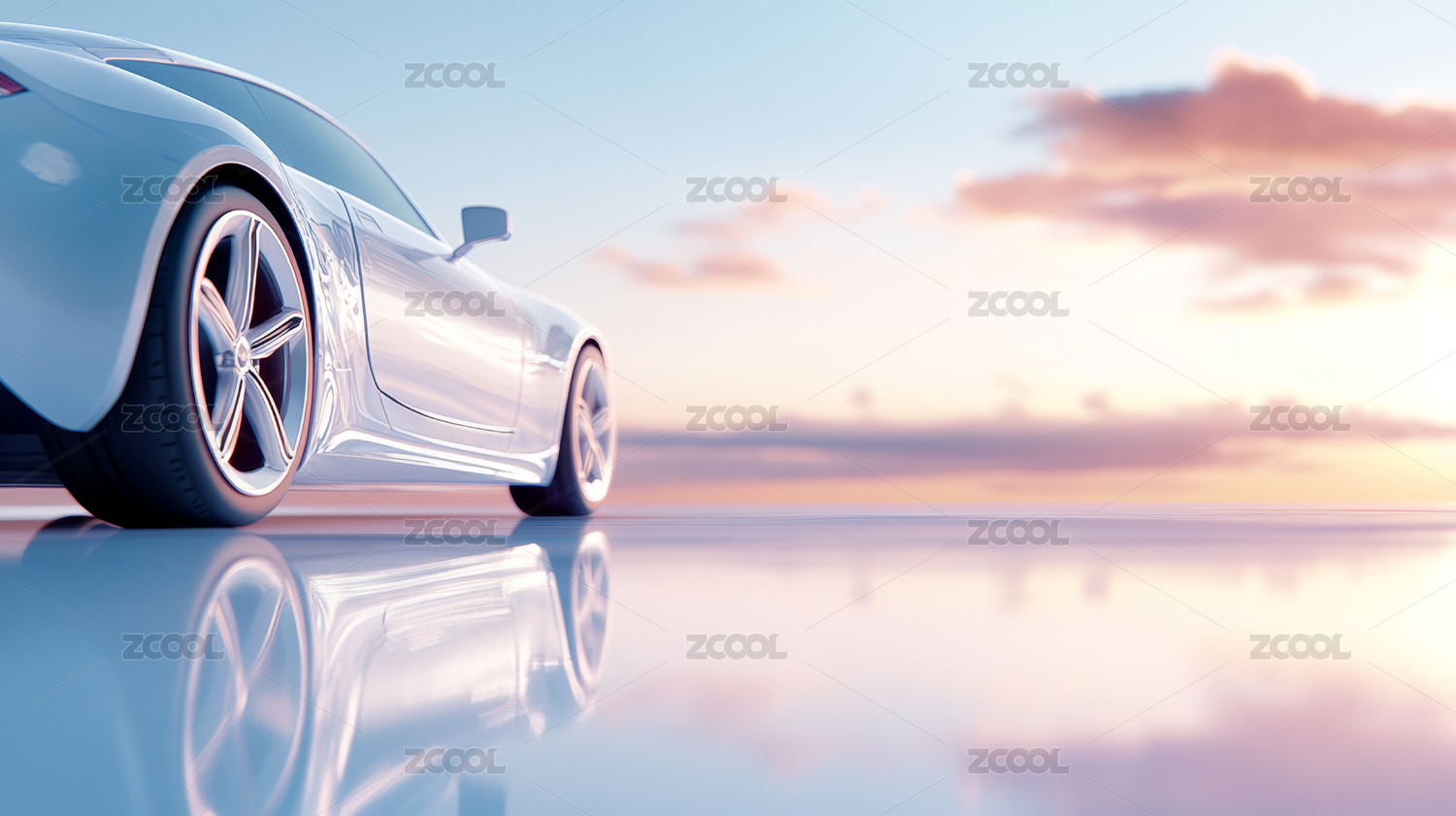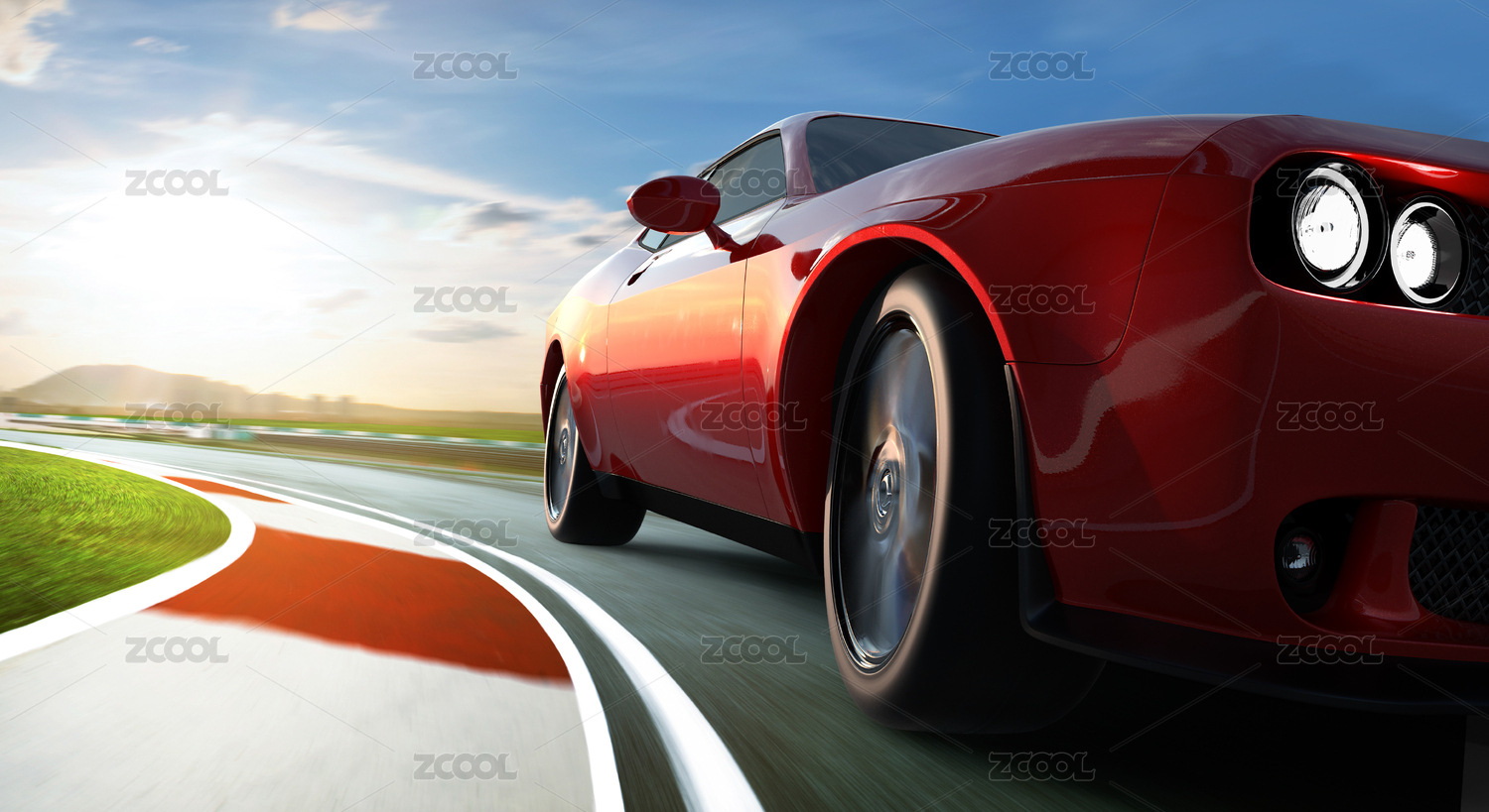 美式肌肉形跑车行驶在晨早的道路 三维渲染