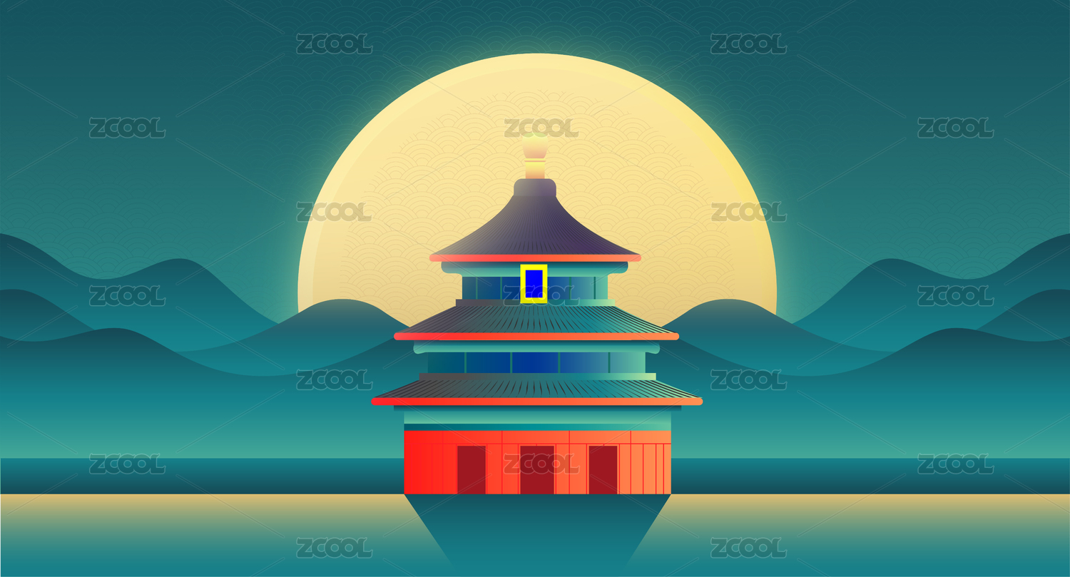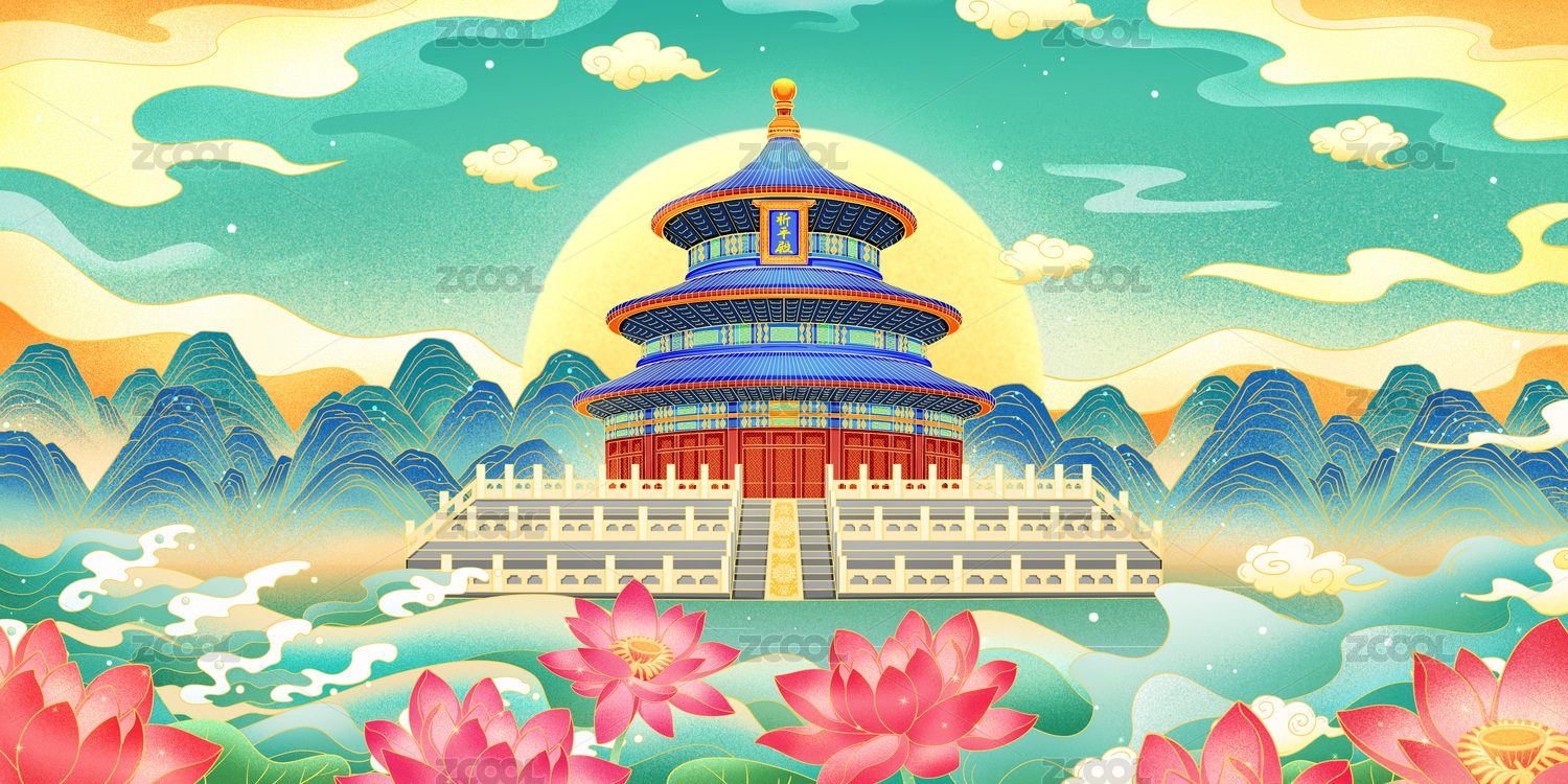北京故宫天安门天坛祈年殿城市地标建筑插画