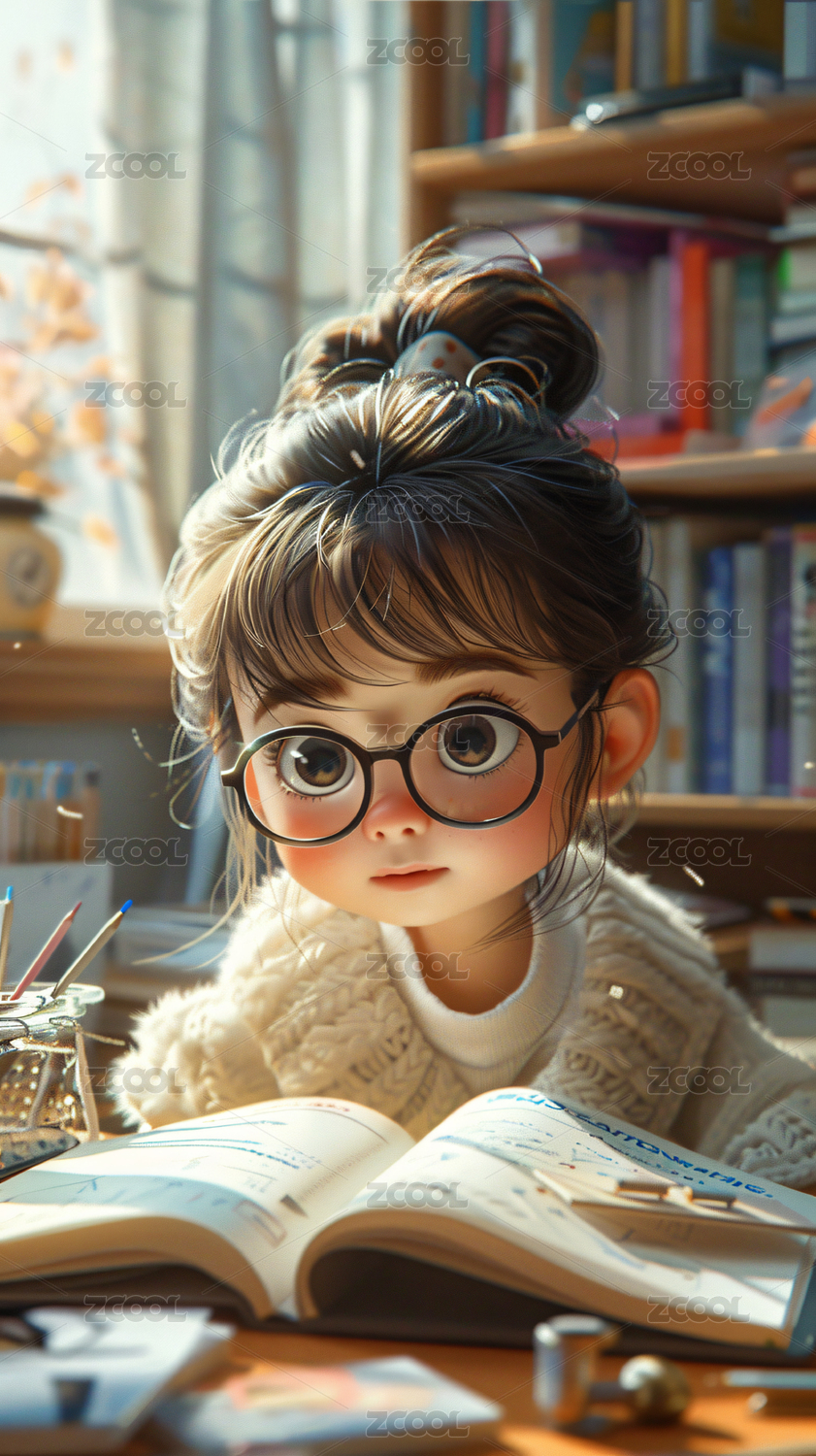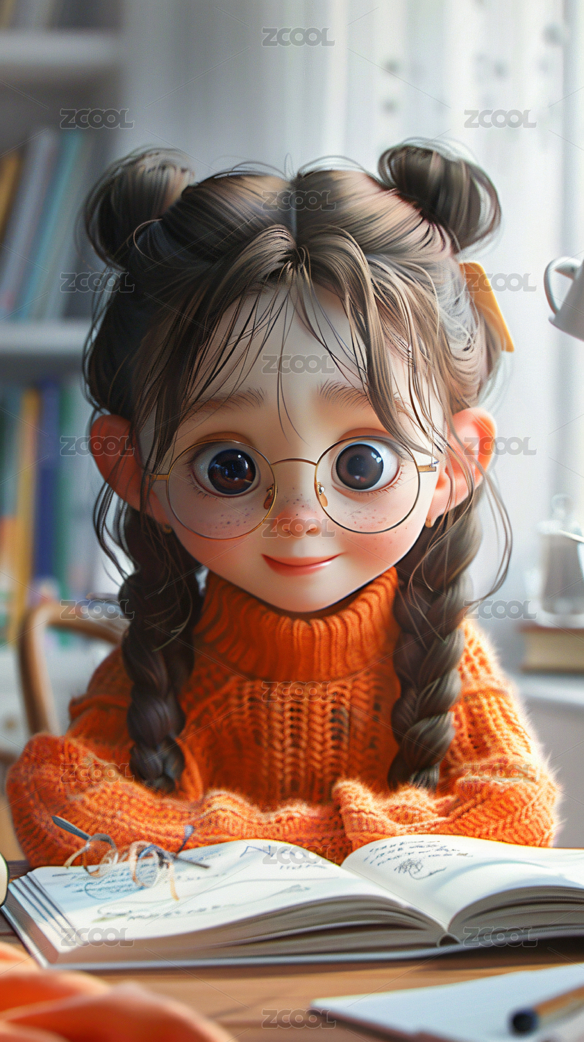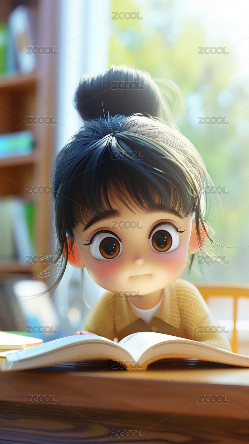 3D正在看书的女孩卡通插画