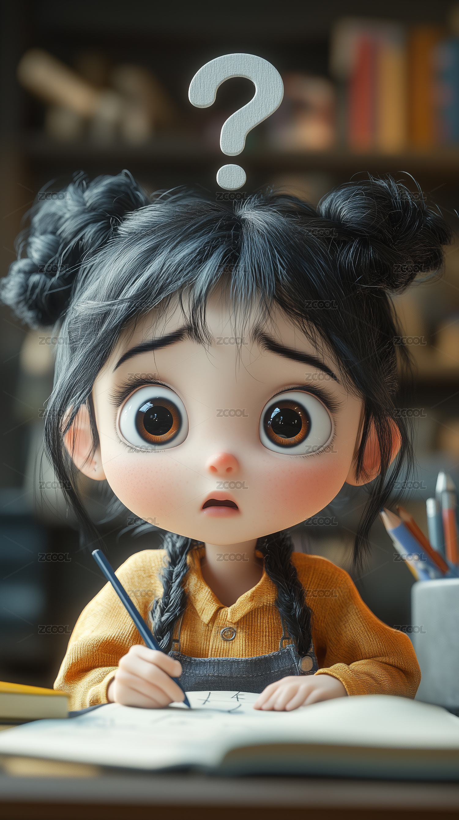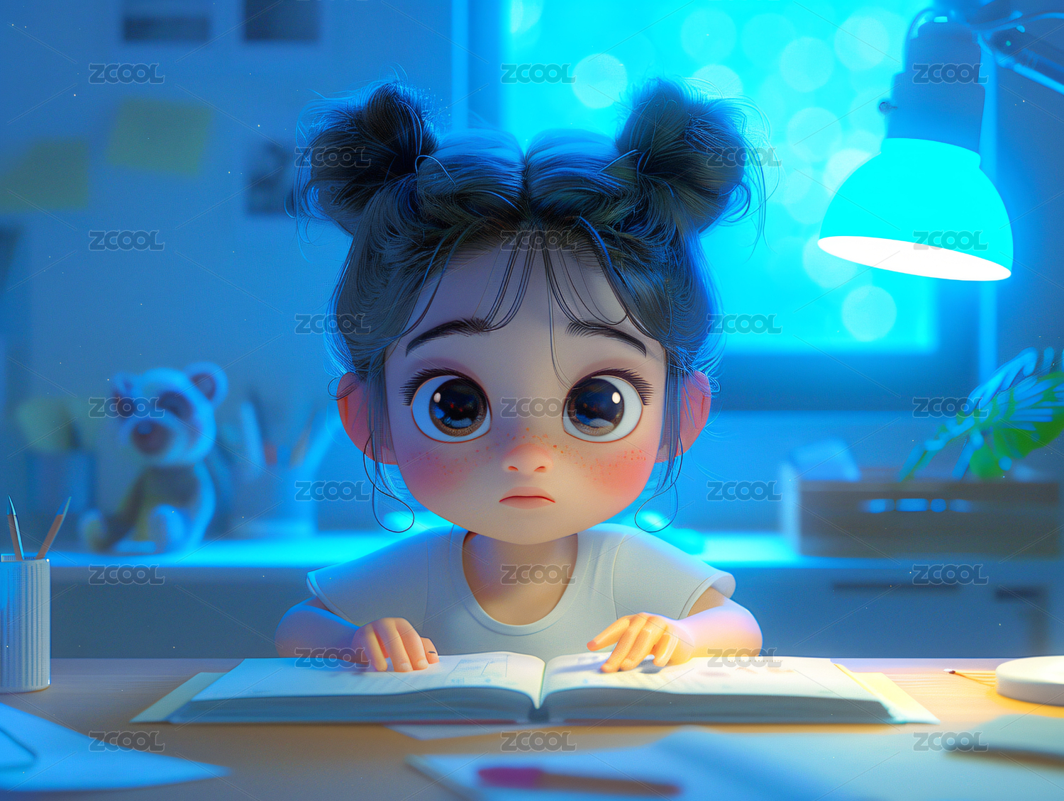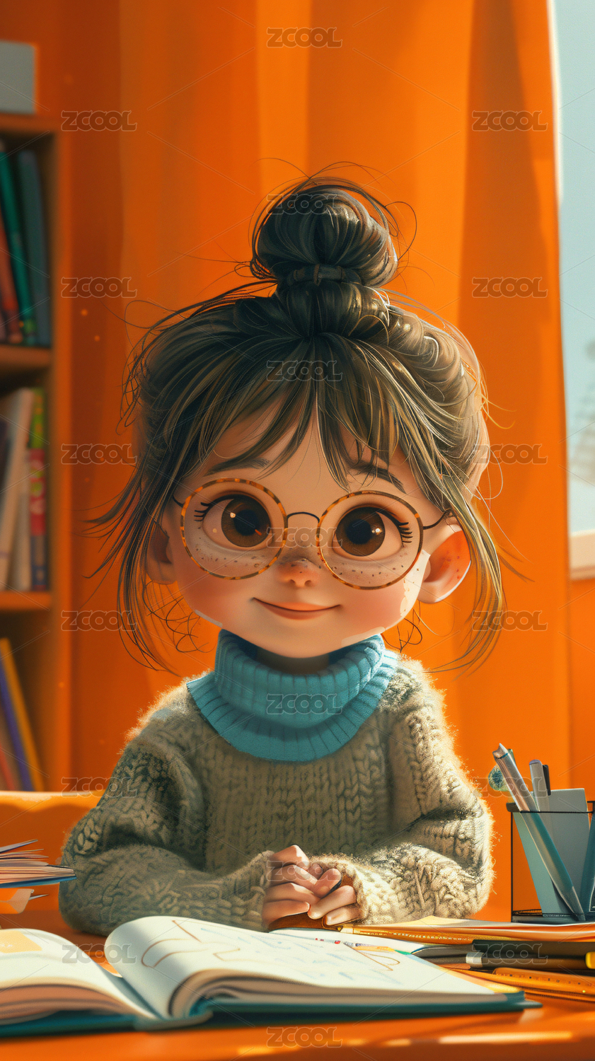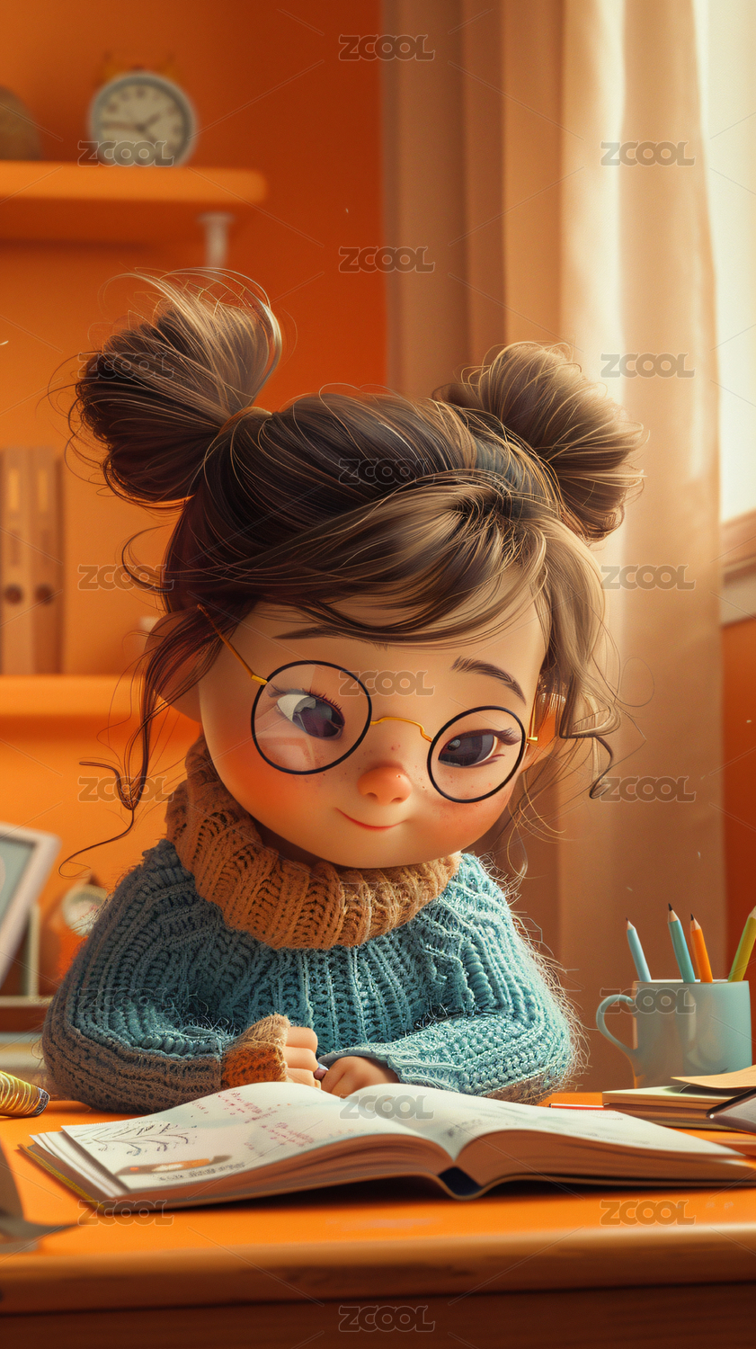 3D正在看书的女孩卡通插画