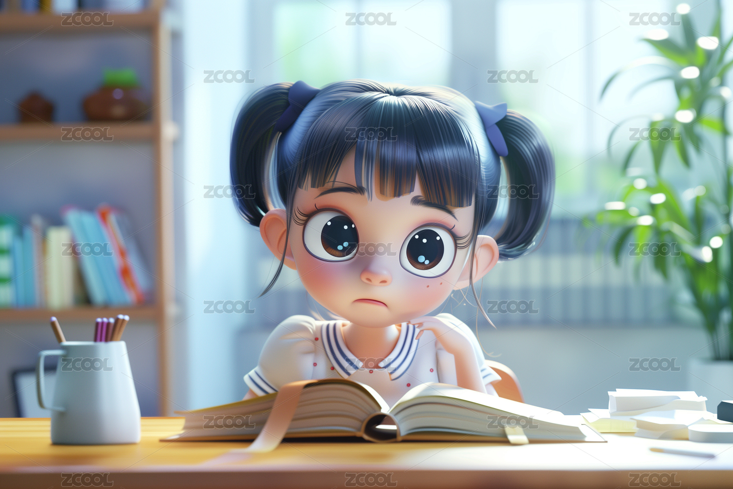 室内窗旁书桌前看书的女性3D卡通立体插画