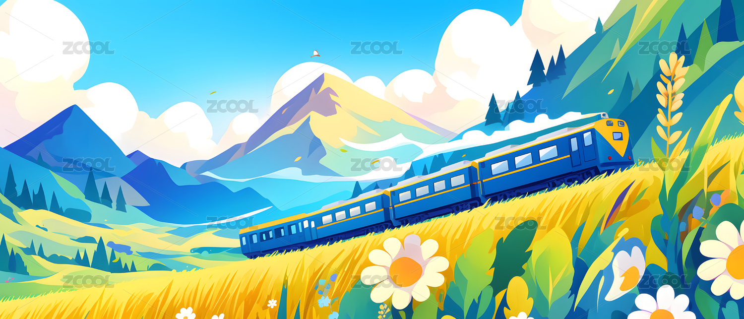 一列红色的火车从山谷间疾驰而过的插画背景素材