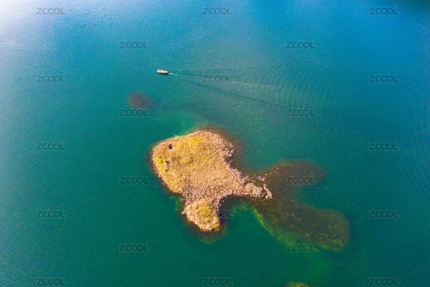 俯拍蓝色湖泊里的一座孤岛中国新疆班迪尔湖