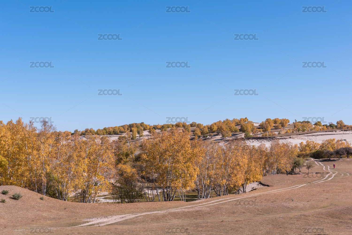 秋天内蒙古乌兰布统坝上草原的沙地和白桦林