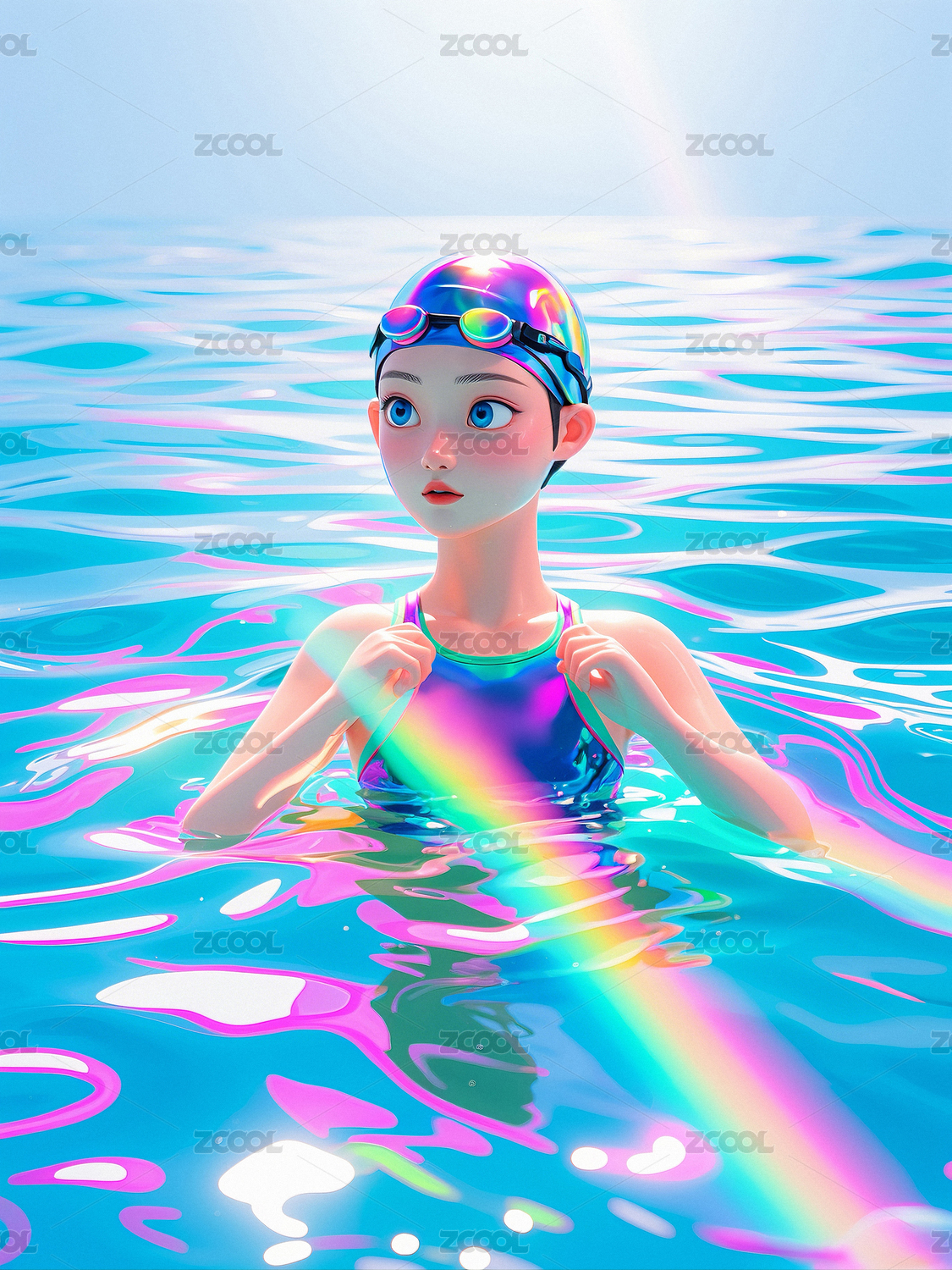 活力四射的夏日场景,卡通泳装少女