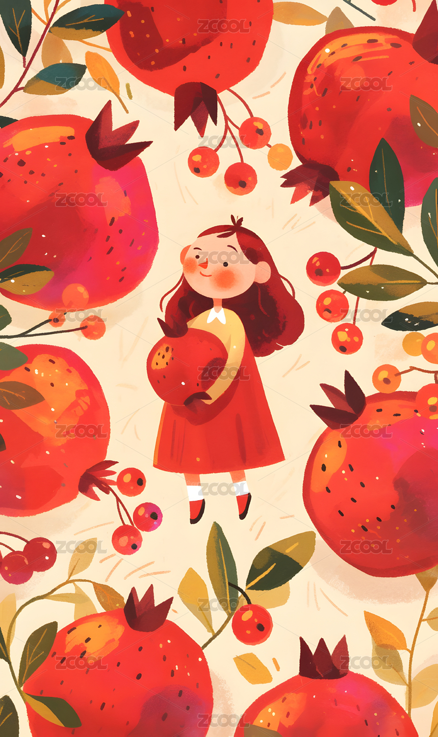女孩摘石榴手绘插画