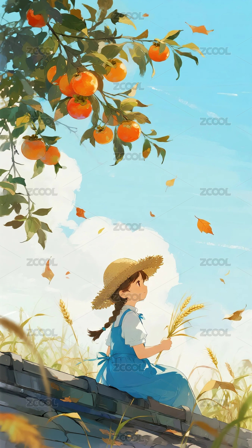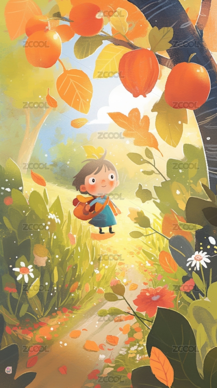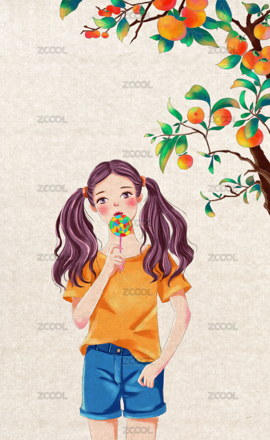 一个柿子树下的女孩儿童插画