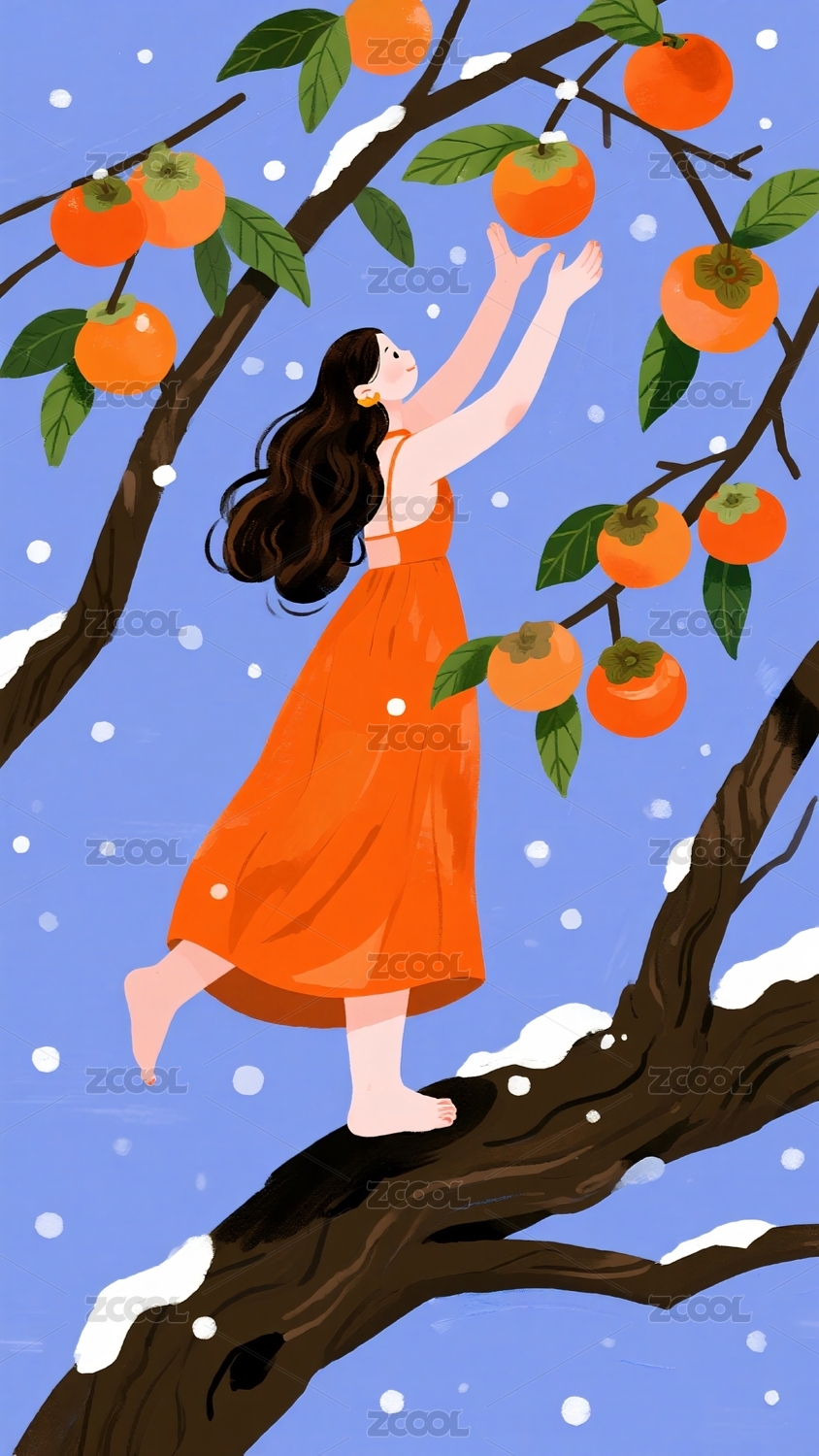 二十四节气之霜降摘柿子插画