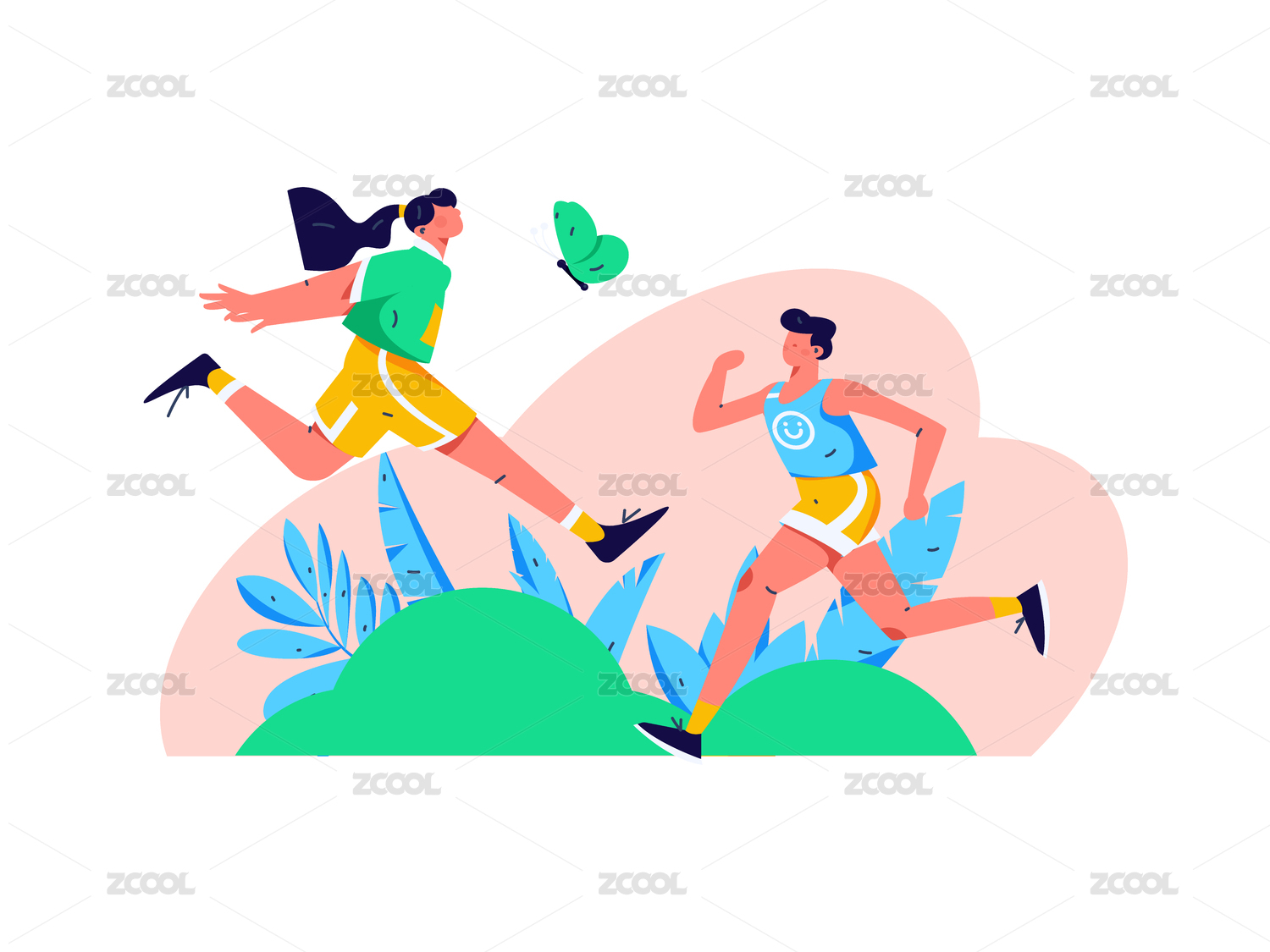 一个健美女性在花草丛间轻盈的跑步做健身运动--扁平化插画