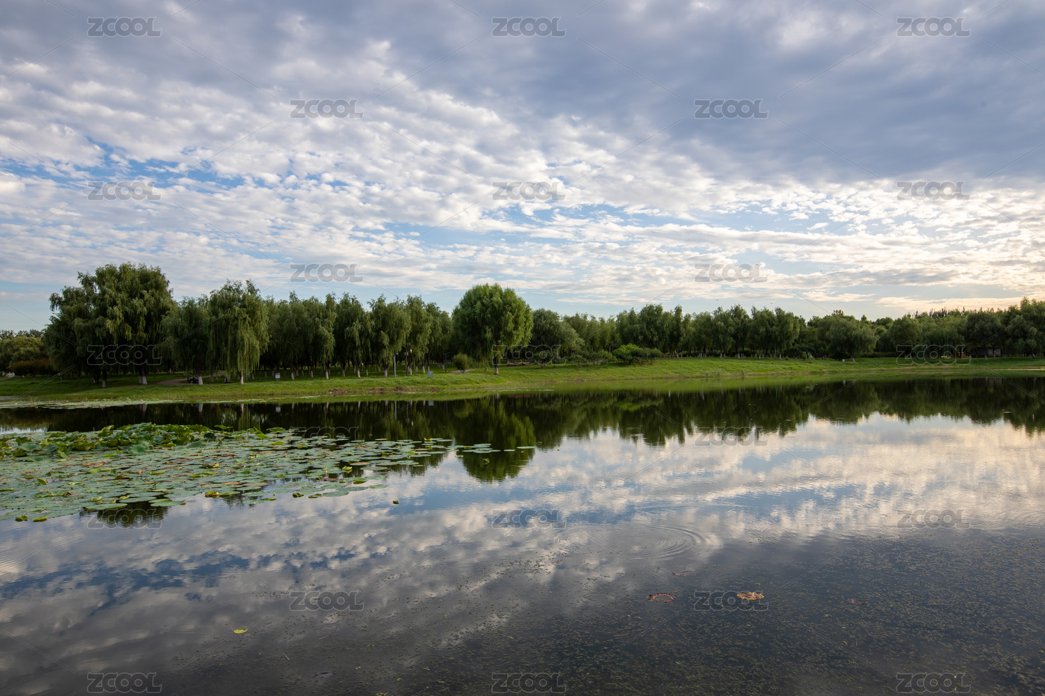 公园蓝天白云湖水大树