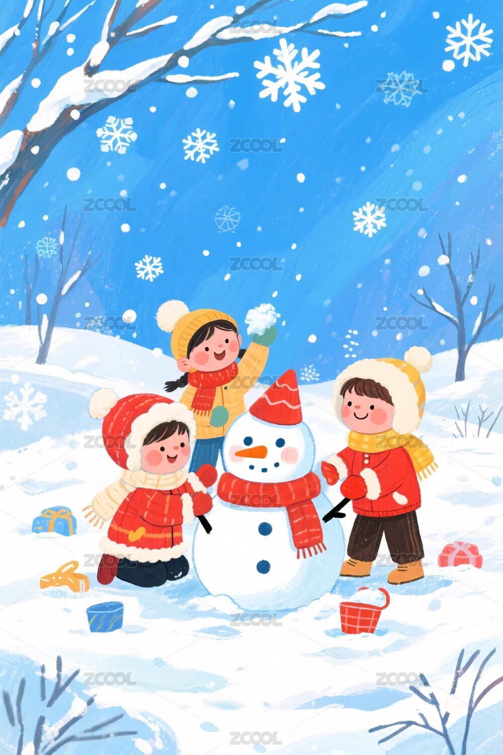 孩子们堆雪人插画