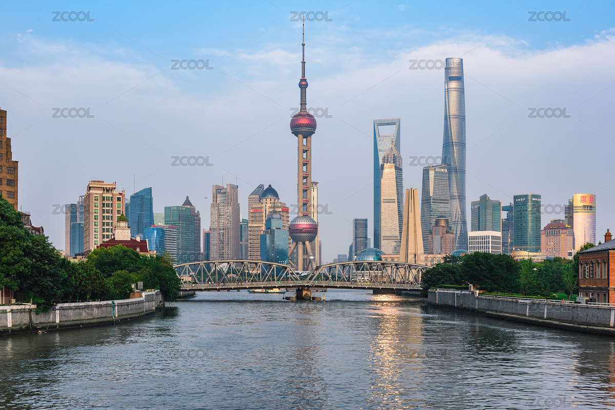 上海苏州河上的外白渡桥和陆家嘴金融中心建筑