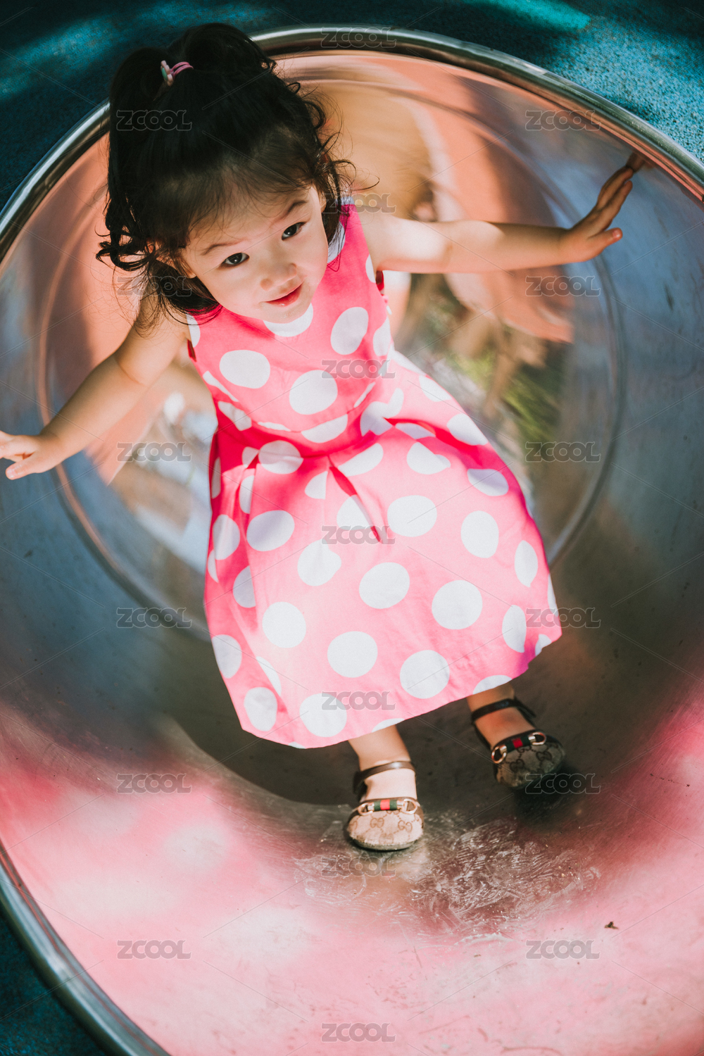 游乐场圆孔滑滑梯的一岁半女孩特写
