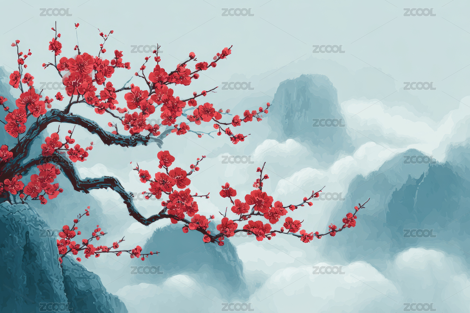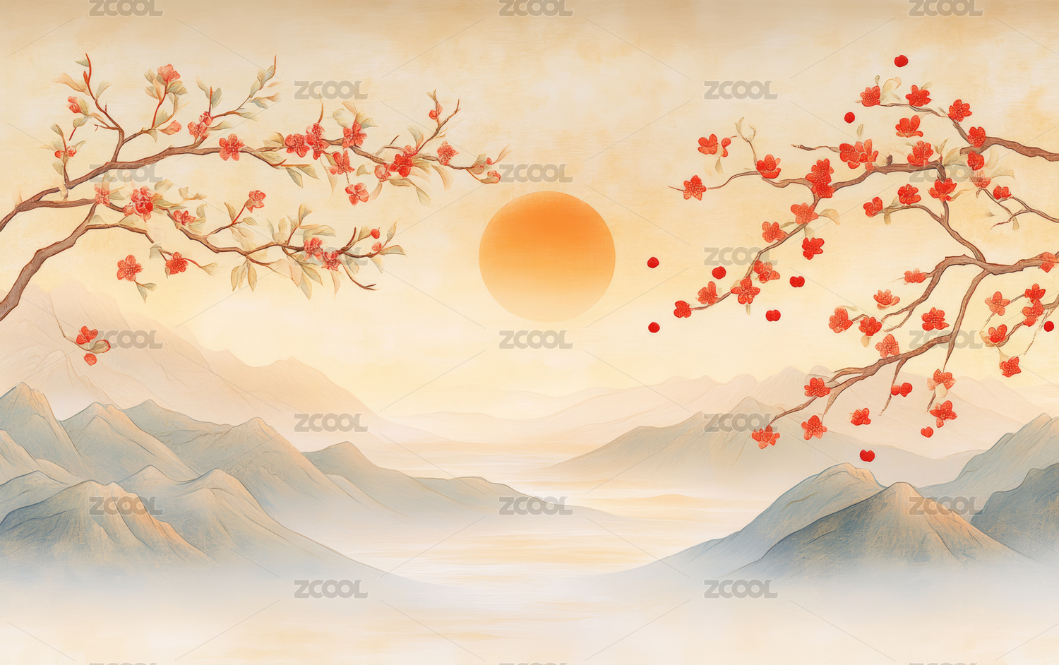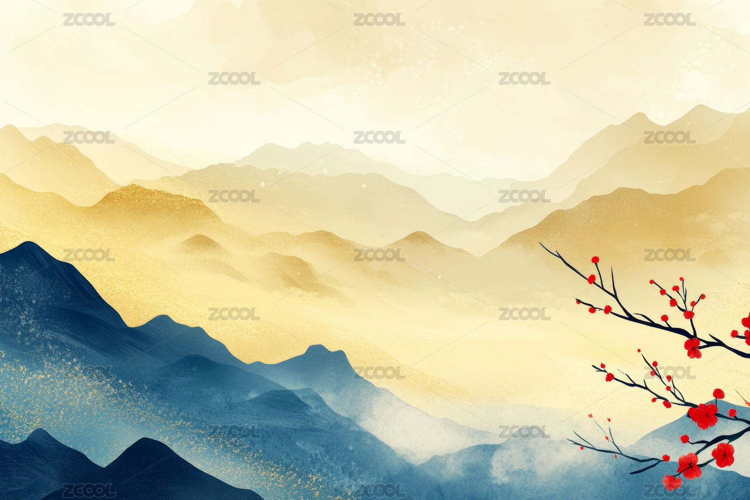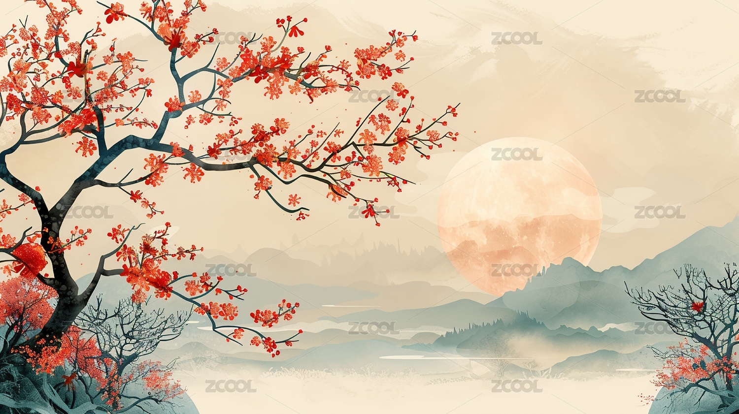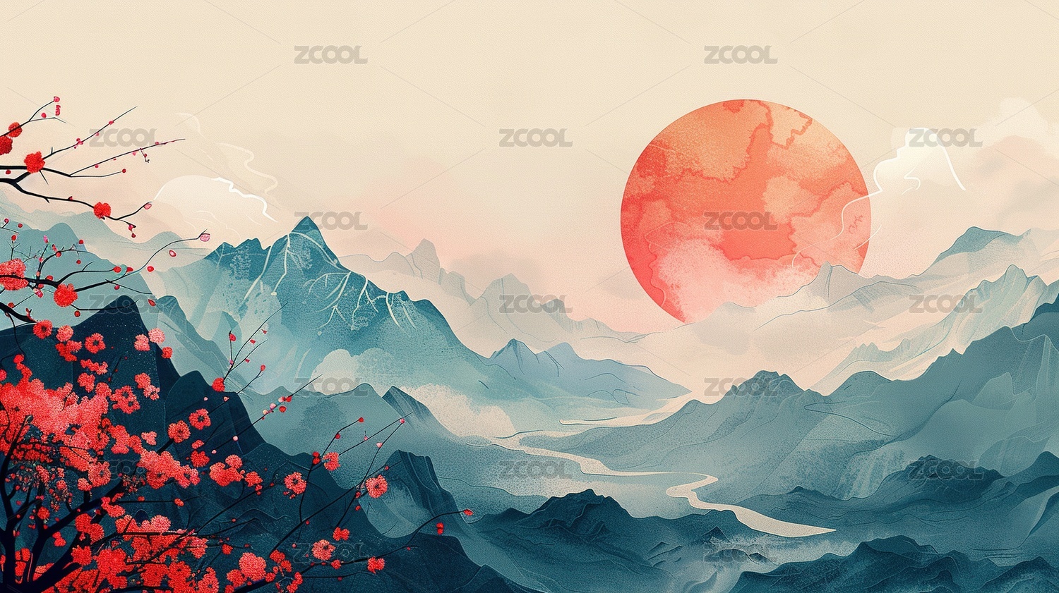 高山,风景,户外,插画,自然,宁静,中国画,背景,地形,月亮