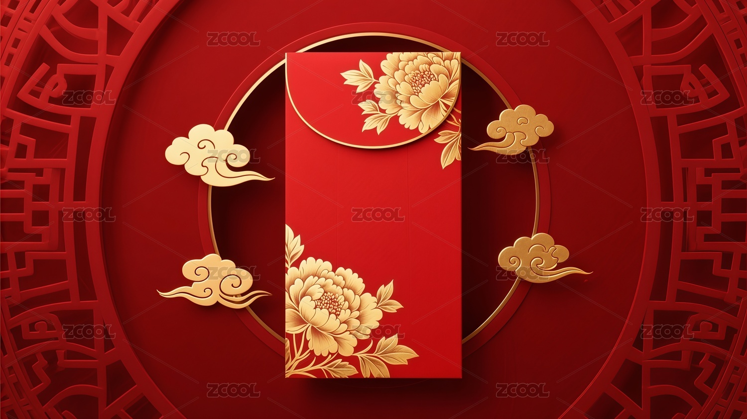 红底金纹间的牡丹新春红包
