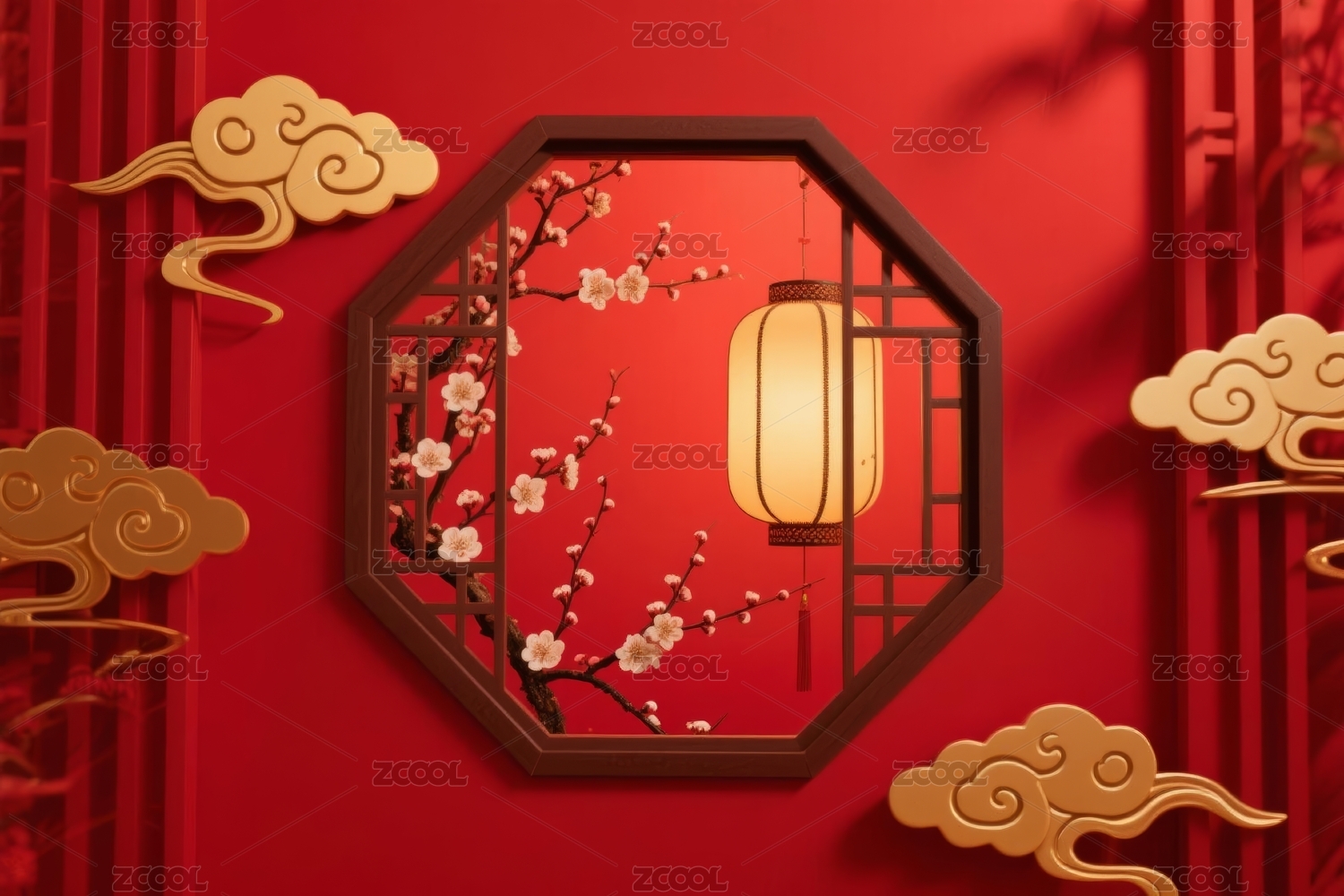 中式窗格红金装饰场景