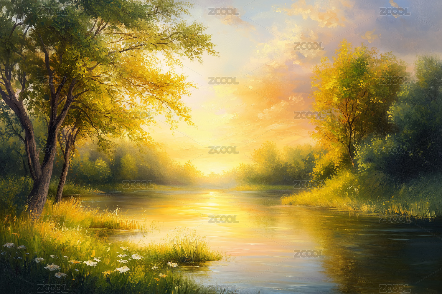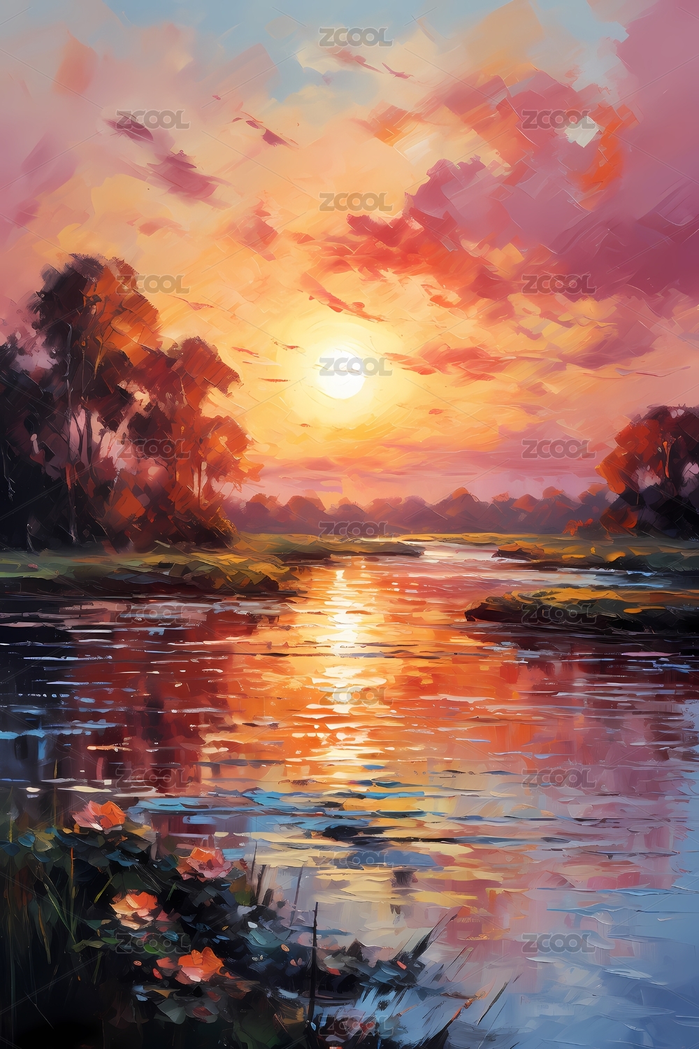 厚涂粗笔触印象派梦幻河边日落景观背景海报
