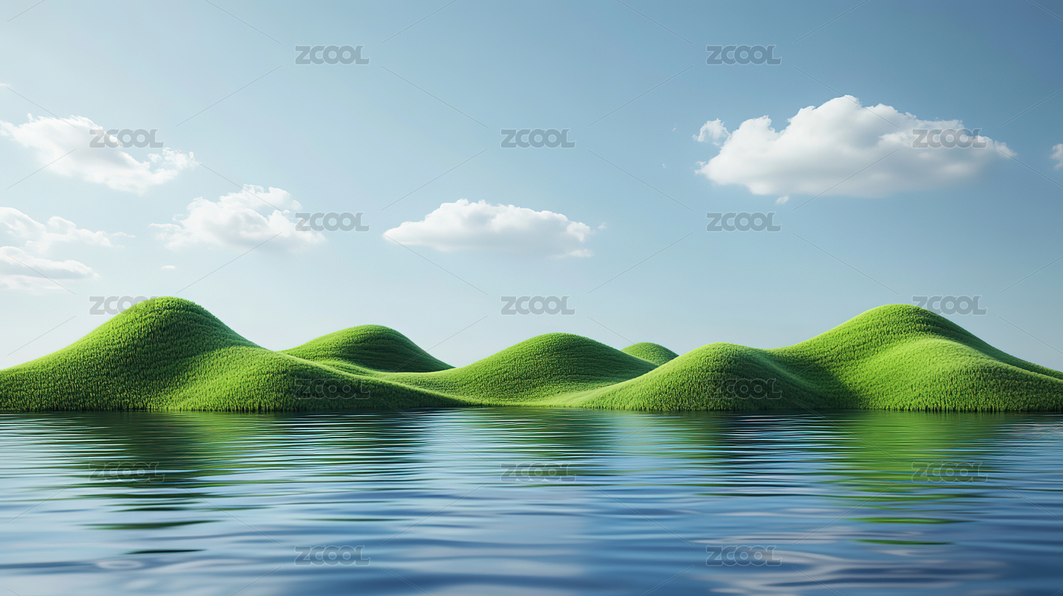 宁静水面的绿色山丘