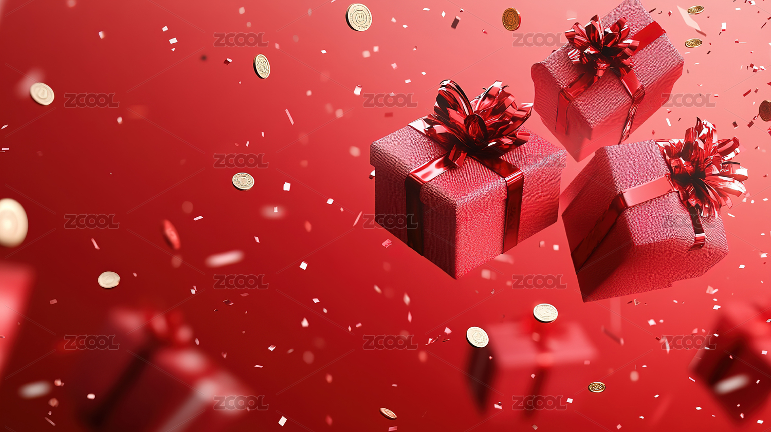 红色礼盒与金色彩带飘落