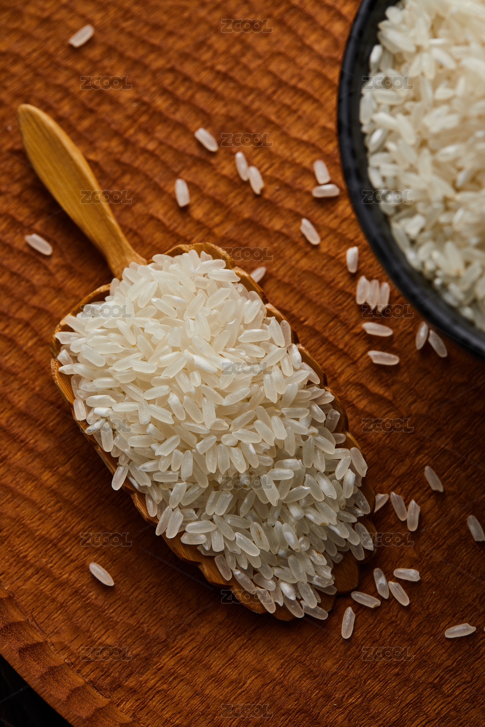 棕色木纹桌上放着一碗散落的大米