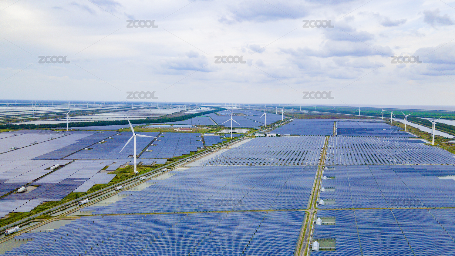 航拍盐城风力发电、光伏发电与鱼塘养殖结合