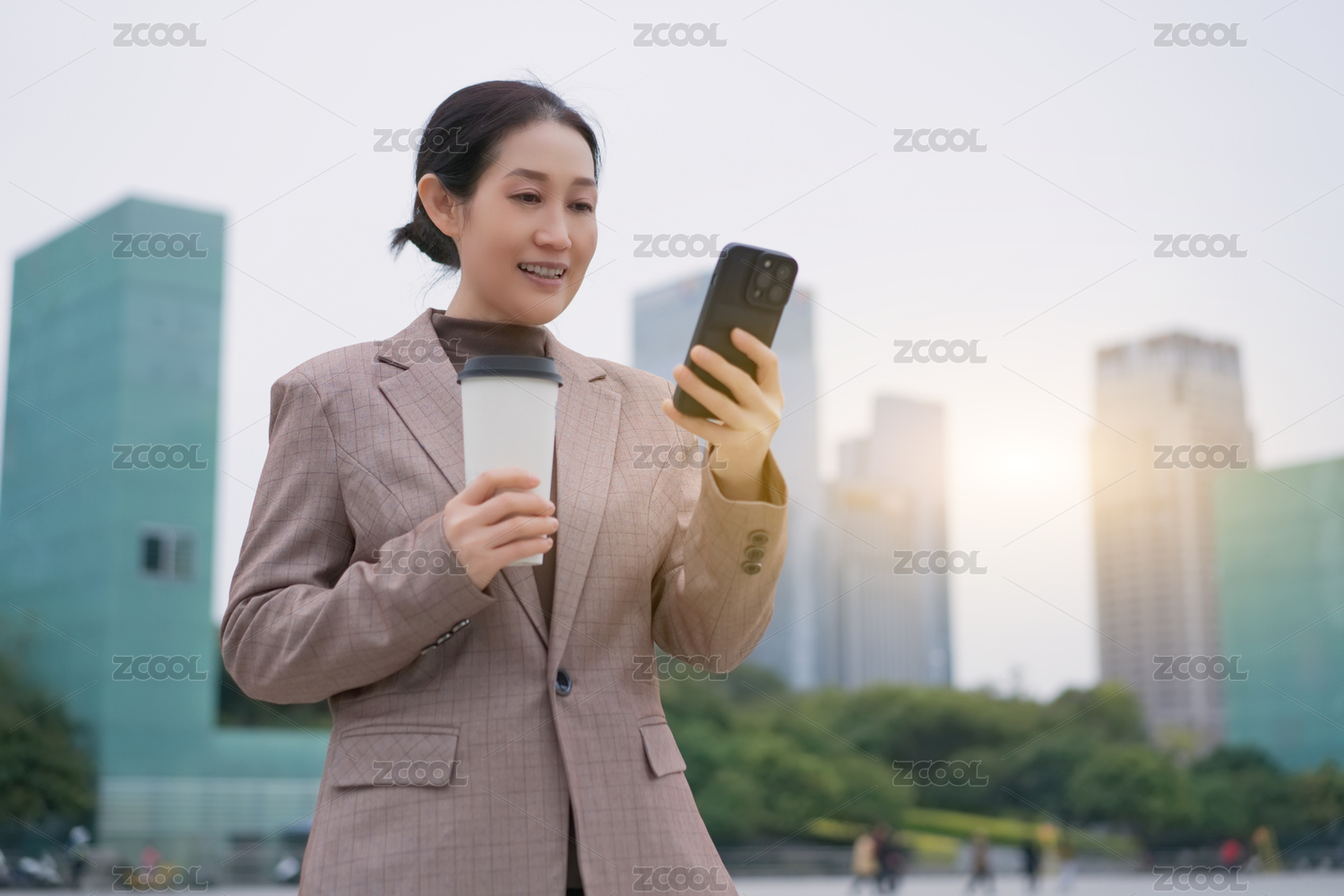 年轻的职业女性在旅途中使用智能手机和咖啡