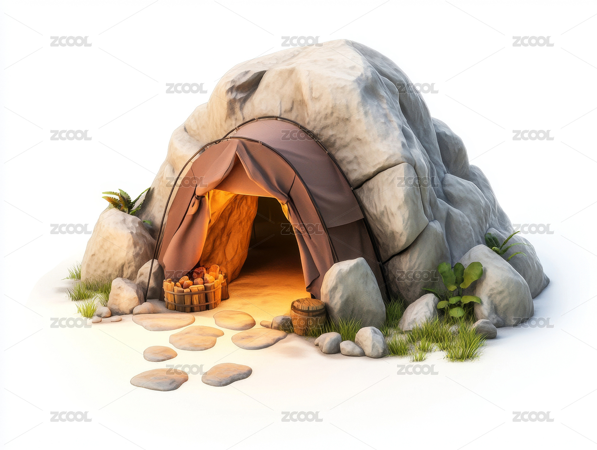山洞,帐篷,露营,石头,草地,火堆,桶,石板路,自然