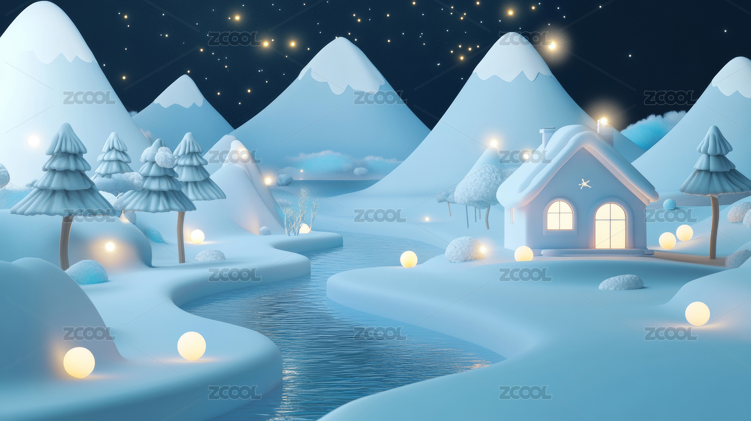 3d卡通唯风格冬天雪地里的房子烟囱冒着烟